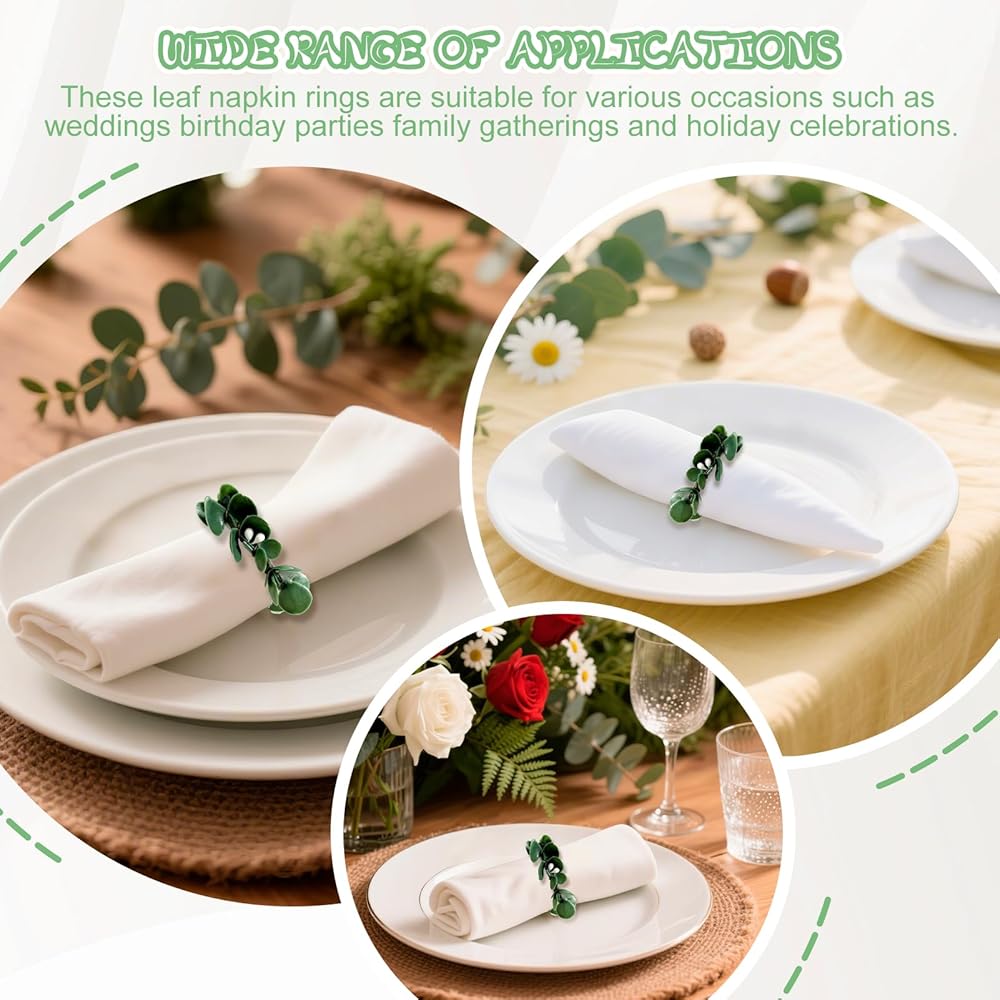 Specific size: The diameter of each flower leaf napkin ring is 6cm/2.36 inches, which can accommodate napkins of various sizes. Simply put the tissue into the eucalyptus leaf tissue ring to help you complete the matching of banquet tissues.