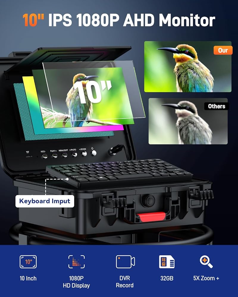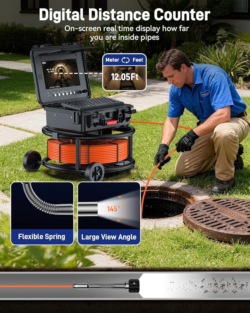 كاميرا مجاري مقاس 10 بوصات مع محدد موقع وعجلات، وكاميرا سباكة ذاتية التسوية وعداد مسافة وتكبير 5X - كاميرا فحص الأنابيب بزاوية 145 درجة مع أضواء وشاشة IPS بدقة 1080 بكسل ومسجل فيديو رقمي بسعة 32 جيجابايت (7 مم - 200 قدم / 60 مترًا)