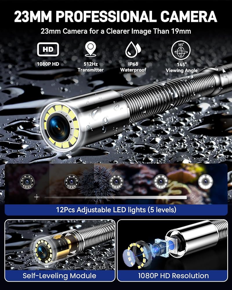 • [مصابيح LED ذاتية التسوية وقابلة للتعديل لتصوير موثوق] تم تصميمها للحصول على وثائق موثوقة، حيث تقوم وحدة التسوية الذاتية المضمنة بالمسبار بتدوير الكاميرا تلقائيًا لتوفير رؤية ثابتة ومستقيمة. مقترنًا بـ 12 مصباح LED قابل للتعديل (يوفر 5 مستويات سطوع) وتصنيف IP68 المقاوم للماء، فإنه يوفر فيديو ساطعًا وواضحًا بدقة 1080 بكسل في الظلام الدامس والظروف الرطبة، مما يقلل من الزوايا المربكة وضعف الرؤية.