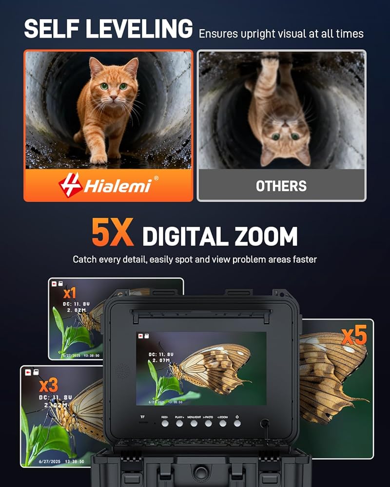 • 【زاوية واسعة 145 درجة وتكبير 5x: من البانورامية إلى المقربة】يجمع نظام كاميرا Hialemi بين عدسة واسعة الزاوية 145 درجة مع تقريب رقمي قوي 5x. تلتقط العدسة الواسعة رؤية بانورامية موسعة للجزء الداخلي للأنبوب، بينما يتيح لك التكبير/التصغير 5x تكبير وتدقيق الشقوق أو الانسدادات البعيدة على الفور بتفاصيل واضحة بدقة 1080 بكسل. يعمل هذا النطاق الديناميكي على تحويل الأنابيب المحصورة إلى مناطق فحص واضحة وقابلة للملاحة.