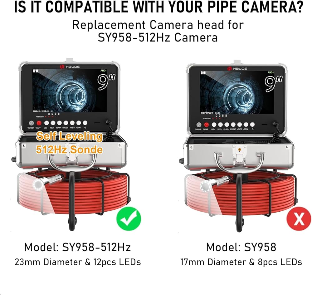 استبدال رأس كاميرا الصرف الصحي مع جهاز إرسال سوند مدمج 512 هرتز، متوافق فقط مع الموديلات: SY958-512 هرتز وF5860، قطر 23 مم (0.9 بوصة)، التسوية الذاتية، ملحقات مسبار 12 LED