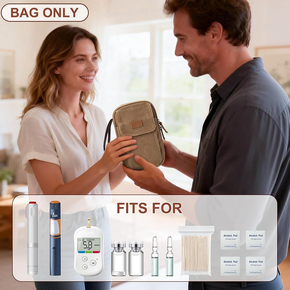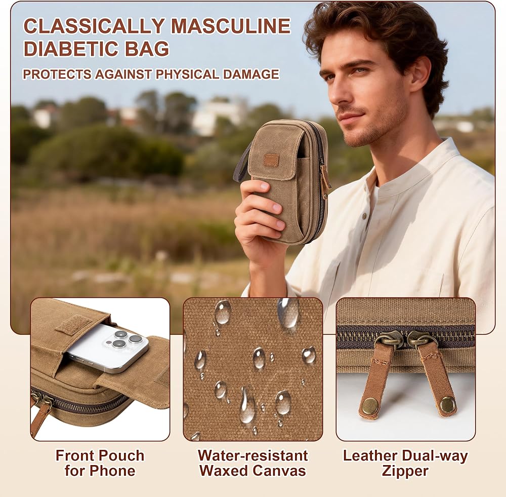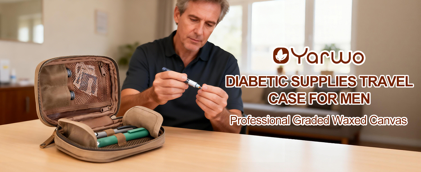 حقيبة سفر من يارو لمستلزمات مرضى السكري للرجال، حقيبة مقاومة للرائحة من القماش المشمع لتخزين مرض السكري مع مشبك جلدي لمراقبة الجلوكوز، وحقنة الأنسولين، وشرائط الاختبار، والمشارط، ومجموعات العناية بمرضى السكري (حقيبة فقط)