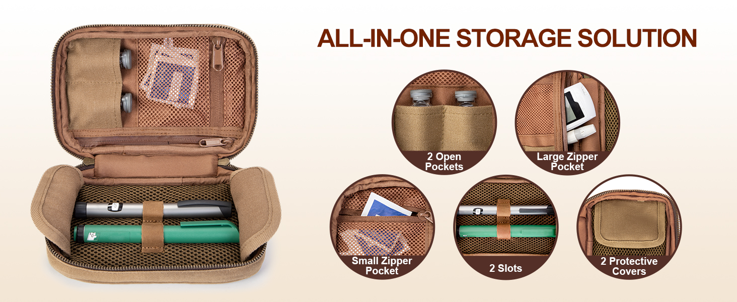• مادة فاخرة: مصنوعة من قماش شمعي عالي التحمل، حقيبة سفر لمرضى السكري تحمي أدوية مرضى السكري بعيدًا عن الماء والخدوش. يجمع الطراز الفريد مع السحابات النحاسية الناعمة بين السحر العتيق والعملية اليومية