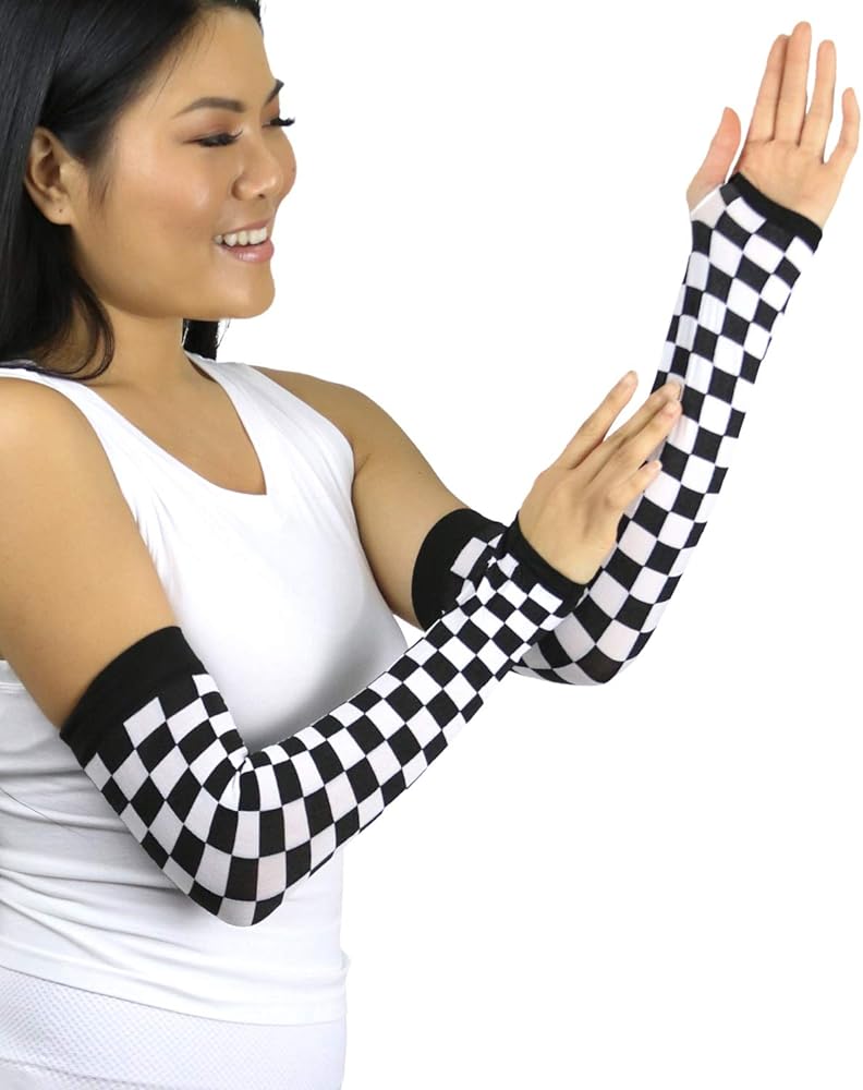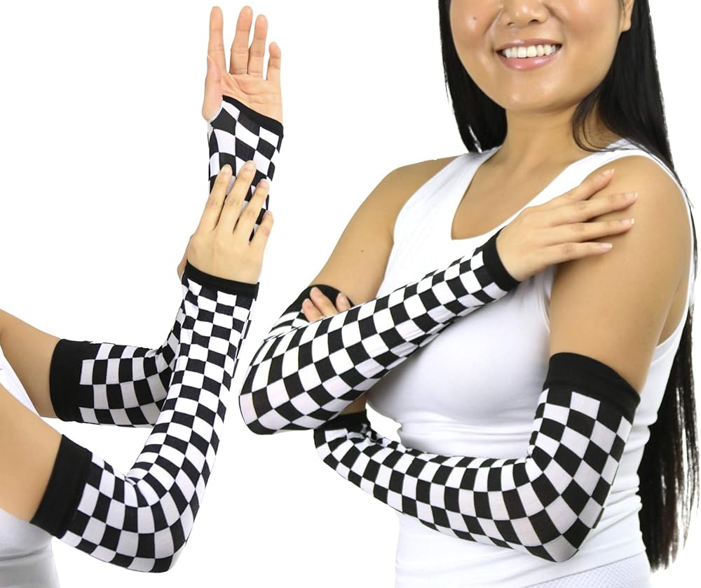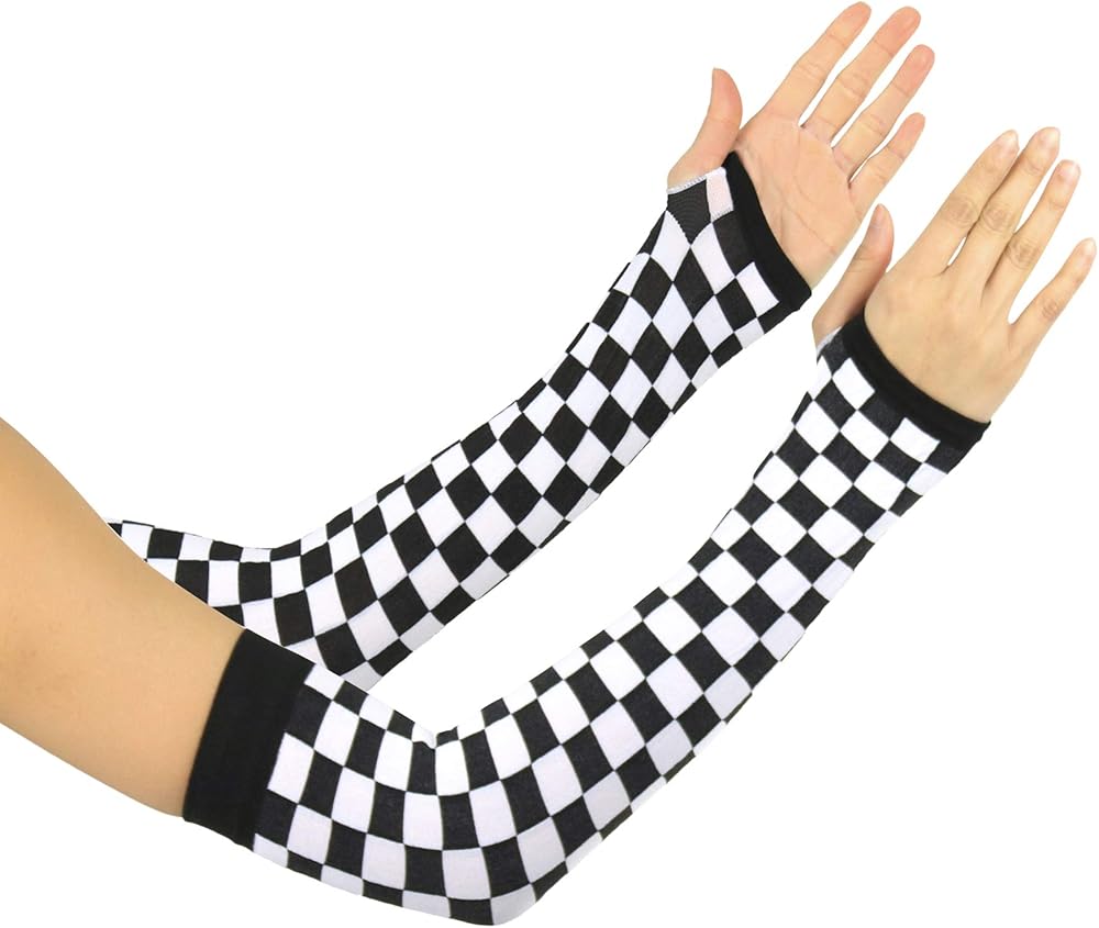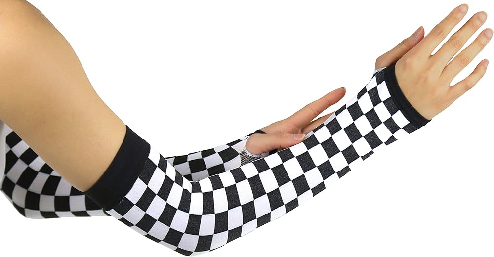 المميزات: هيكل كامل للساعد، مع شريط مطاطي غير شفاف في الأطراف لملاءمة مريحة. نمط رقعة الشطرنج باللونين الأبيض والأسود مطبوع على كامل جسم الملابس، مع فتحة للإبهام لإكمال المظهر بدون أصابع.