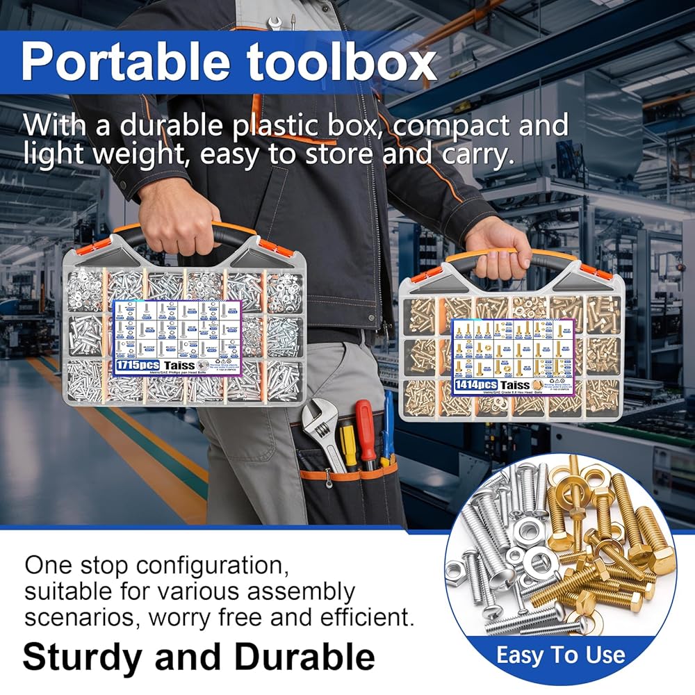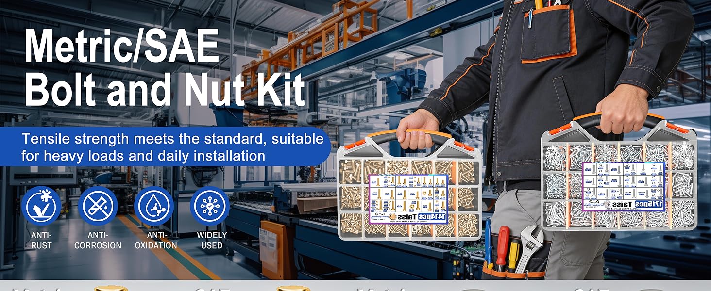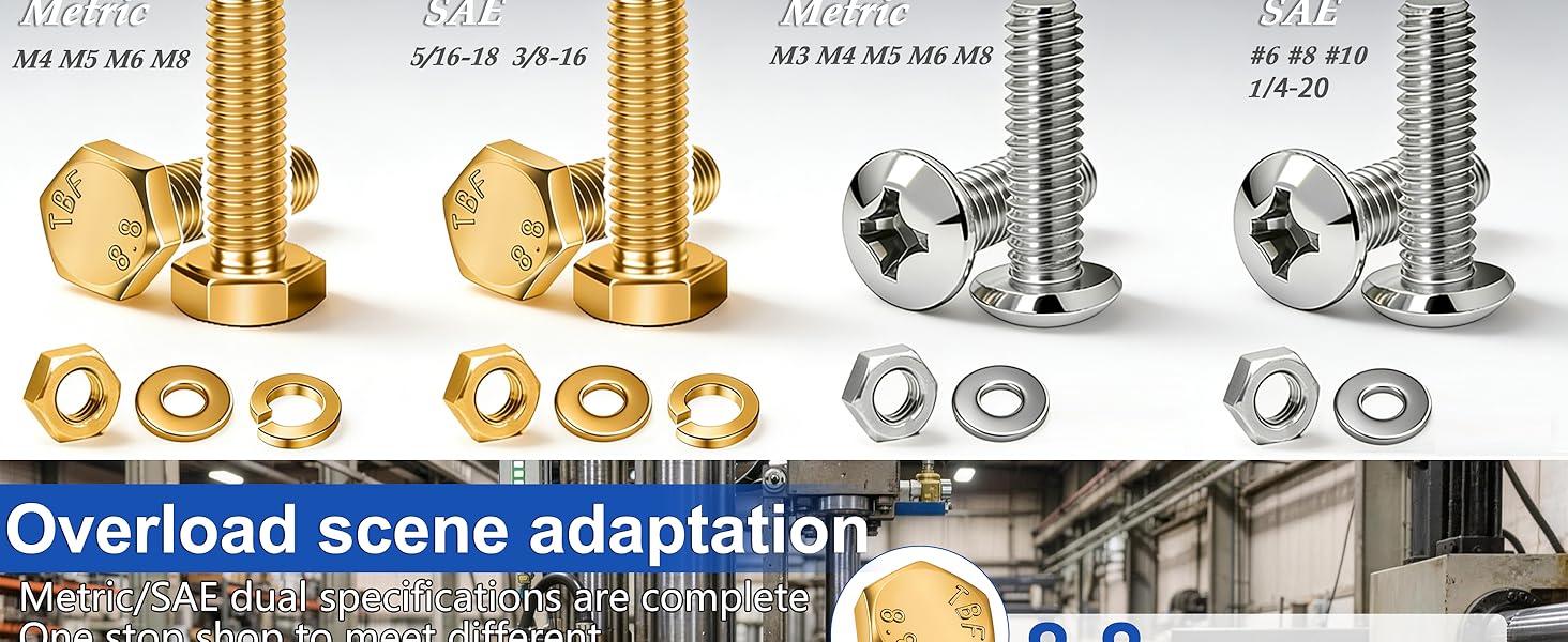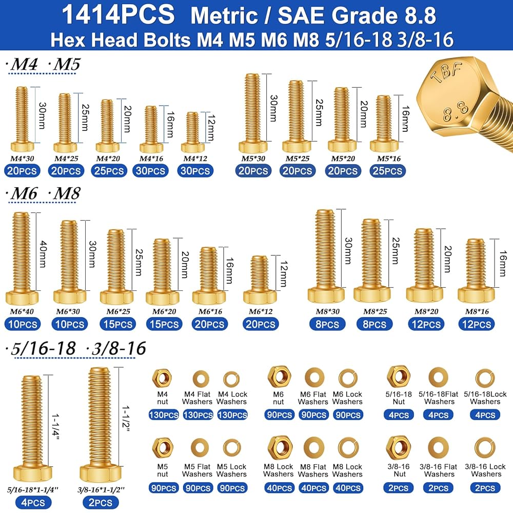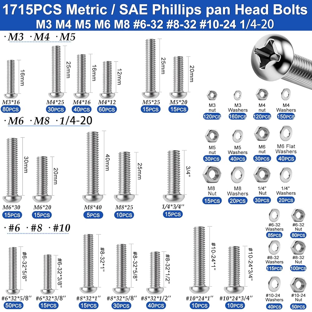 • 3129 قطعة بأحجام متعددة (SAE وMetric)، 39 مقاسًا (M3 M4 M5 M6 M8، #6 #8 #10,1/4-20,5/16-18,3/8-16)، نوع الرأس (رأس فيليبس ورأس سداسي)، مسامير رأس فيليبس SAE (705 قطعة)، براغي رأس فيليبس مترية (1010 قطع)، وSAE وMetric Hex مسامير (1414 قطعة)