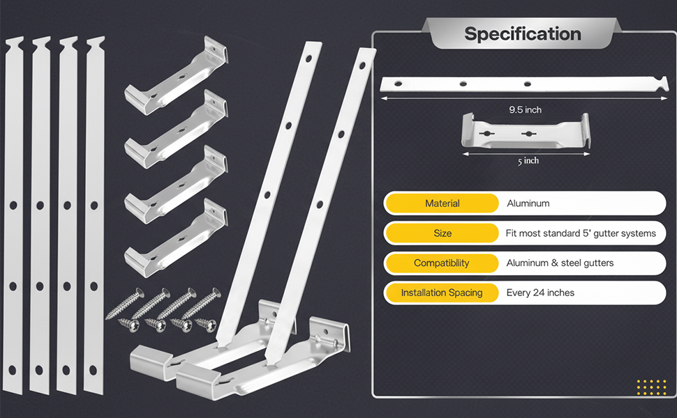 【مصممة للأسقف بدون حواف】مصممة خصيصًا للمنازل التي لا تحتوي على ألواح فآسيا، تتميز هذه الشماعات بأشرطة ألومنيوم مقاس 9.5 بوصة تسمح بالتركيب المباشر على سطح السقف. إنها توفر حل تثبيت موثوقًا لأنظمة مزراب الألمنيوم أو الفولاذ القياسية مقاس 5 بوصات.