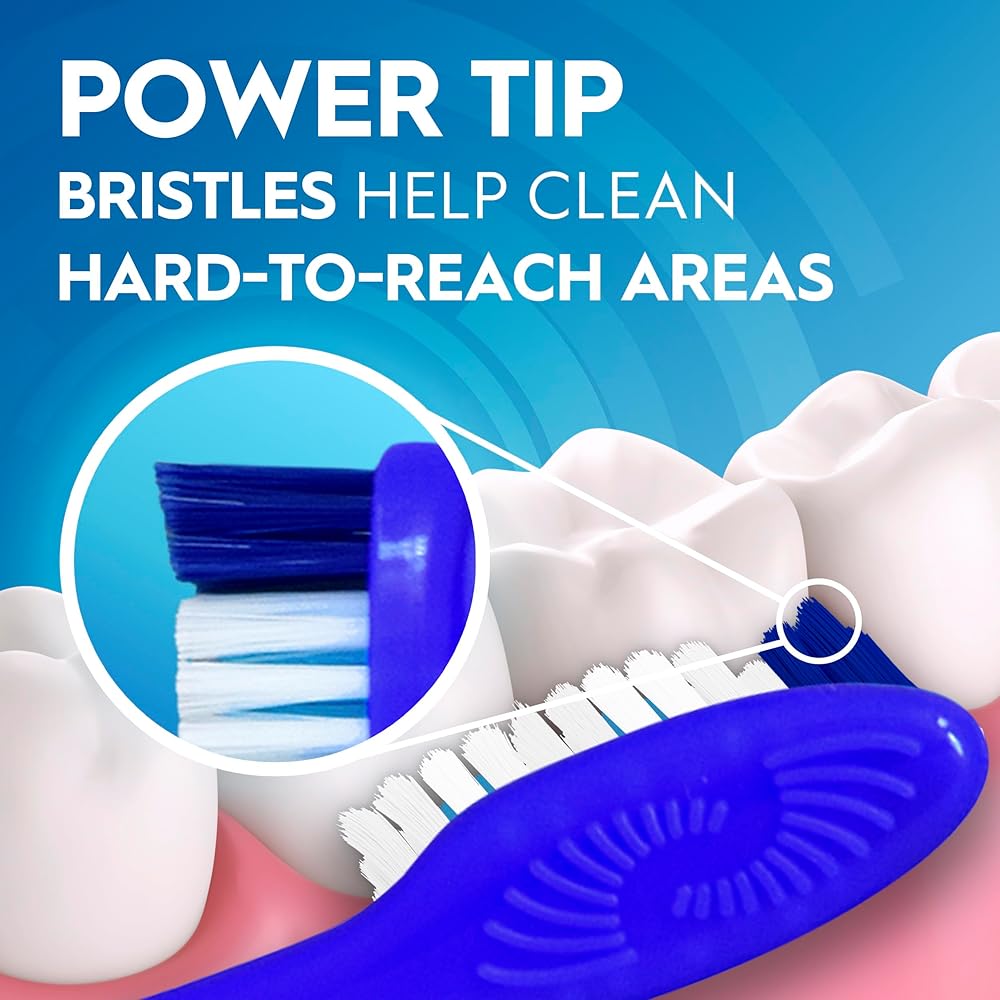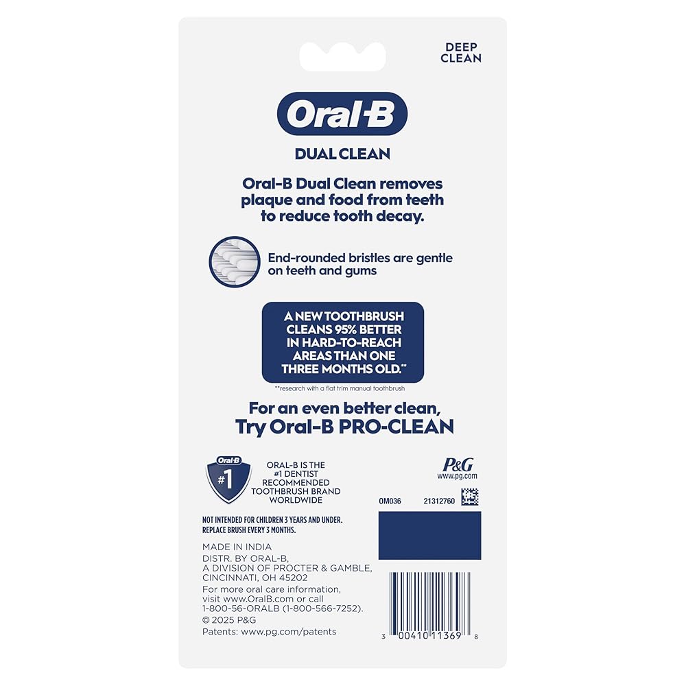 The Oral-B Dual Clean toothbrush has dual circle zones that remove plaque. In addition, the hi-lo bristles on this toothbrush remove plaque and food from teeth to reduce tooth decay. The Oral-B Dual Clean toothbrush also has power tip bristles that help clean hard-to-reach areas. Furthermore, the tongue cleaner removes odor-causing bacteria, and the easy-to-use comfort grip handle provides comfort and control of your toothbrush. For the best results, change your toothbrush regularly. A new toothbrush cleans 95% better in hard-to-reach areas*. Oral-B is the #1 Toothbrush Brand Used by Dentists Worldwide. *vs. one 3 months old; research with a flat trim toothbrush