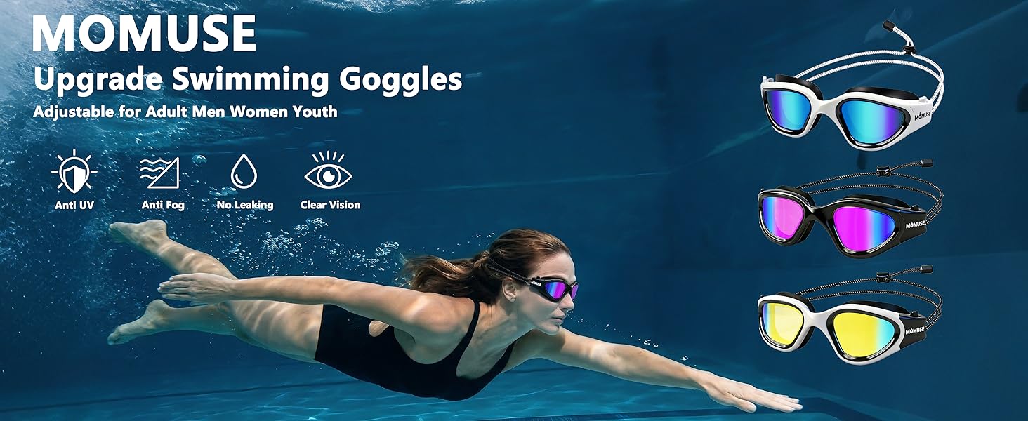 ملاءمة مريحة ولا تحتوي على عيون راكون: تأتي نظارات حمام السباحة MOMUSE مع حشية سيليكون مريحة تعمل على توحيد الضغط حول منطقة العين. مع تصميم خفيف الوزن (0.1 كجم)، يساعد هذا على منع العلامات والانزعاج وعيون الراكون. يضمن الهيكل المريح ملاءمة مريحة دون الإضرار بالأنف. مثالية للسباحة في الأماكن المغلقة وركوب الأمواج والغوص.