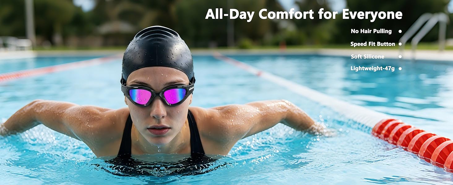 سهلة التعديل ولا تسحب الشعر: تم تصميم نظارات السباحة للبالغين من MOMUSE بحزام بنجي ومشبك تبديل سريع الملاءمة. فقط قم بتمرير الإبزيم لتغيير إحكامه ليناسب أحجام الرأس المختلفة، مما يقلل من سحب الشعر. يستخدم الحزام المطاطي الخاص بنا أشرطة مرنة فائقة النعومة، وهو بديل ألطف للسيليكون التقليدي. يوفر هذا ملاءمة ناعمة توفر الراحة طوال اليوم، حتى أثناء السباحة الطويلة.