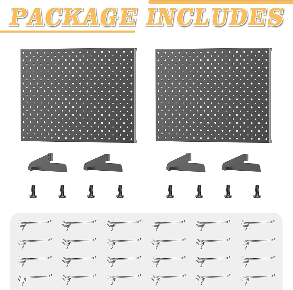 تصميم بفتحة مزدوجة: تتميز كل لوحة بيجبورد بفتحات مقاس 1/8 بوصة و1/4 بوصة مع مسافة 1 بوصة، وتناسب معظم خطافات البيجبورد القياسية. تحتوي كل لوحة على خطافات ربط مقاس 12 1/4 بوصة لتخزين الملحقات أو العناصر اليدوية بأحجام مختلفة