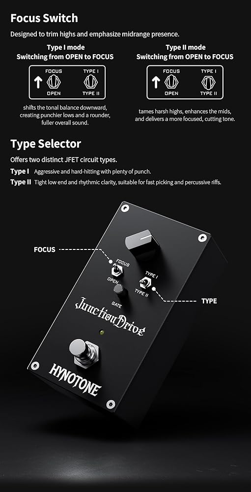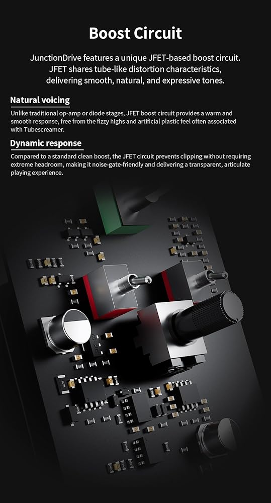 【دائرة تعزيز JFET فريدة من نوعها】- توفر نغمات ناعمة وطبيعية تشبه الأنبوب مع تناغمات غنية، وتجنب الارتفاعات الغامضة والشعور الاصطناعي الذي غالبًا ما يوجد في الدواسات المعتمدة على الصمام الثنائي.
