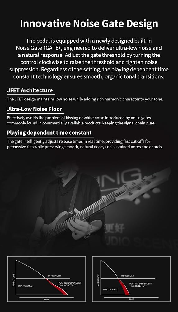 【بوابة ضوضاء مبتكرة مدمجة】- تصميم منخفض الضوضاء للغاية مع مقبض عتبة قابل للتعديل، مما يشدد قمع الضوضاء مع الحفاظ على إشارتك طبيعية ومستجيبة.