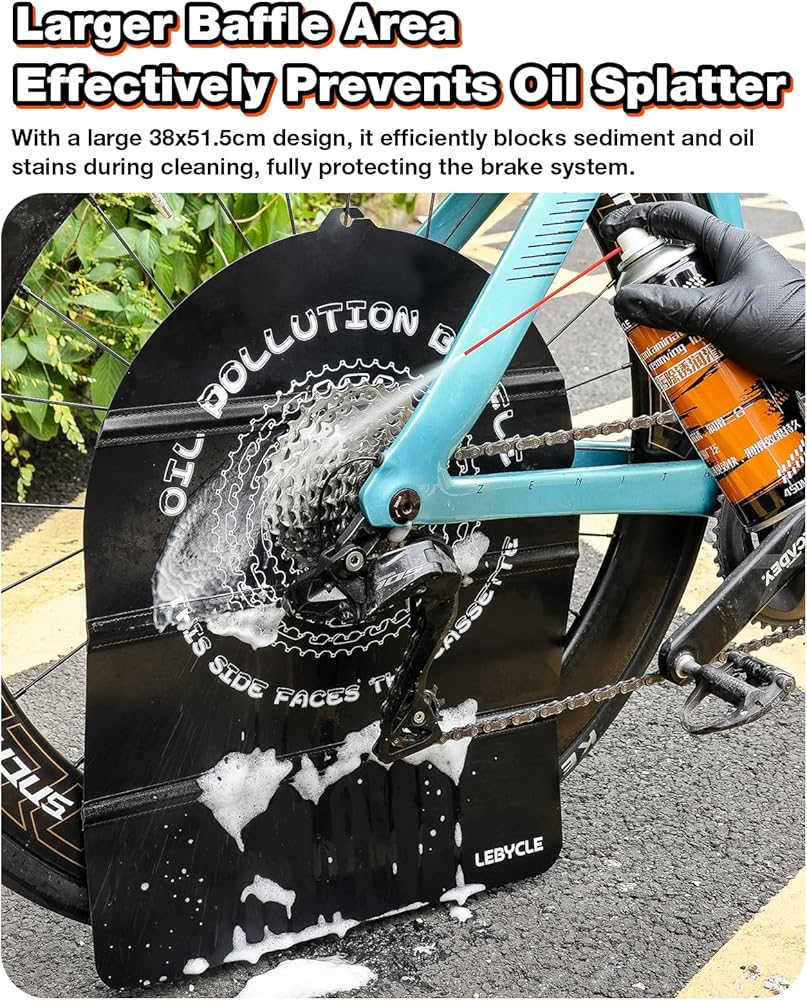 يمنع تناثر الزيوت والأوساخ: يحمي واقي الأوساخ الكبير مقاس 380 × 512 مم دوار القرص والفرجار من مزيل الشحوم والطين ورذاذ الزيت أثناء تنظيف الدراجة، مما يساعد على تجنب صرير الفرامل المزعج