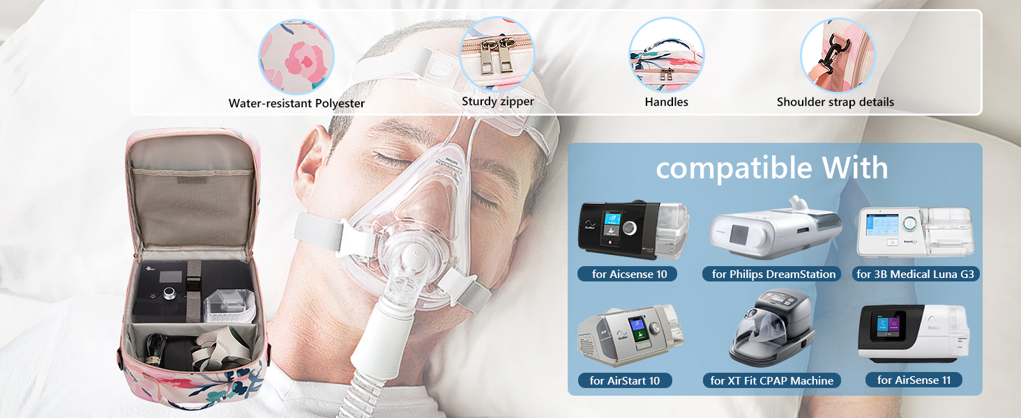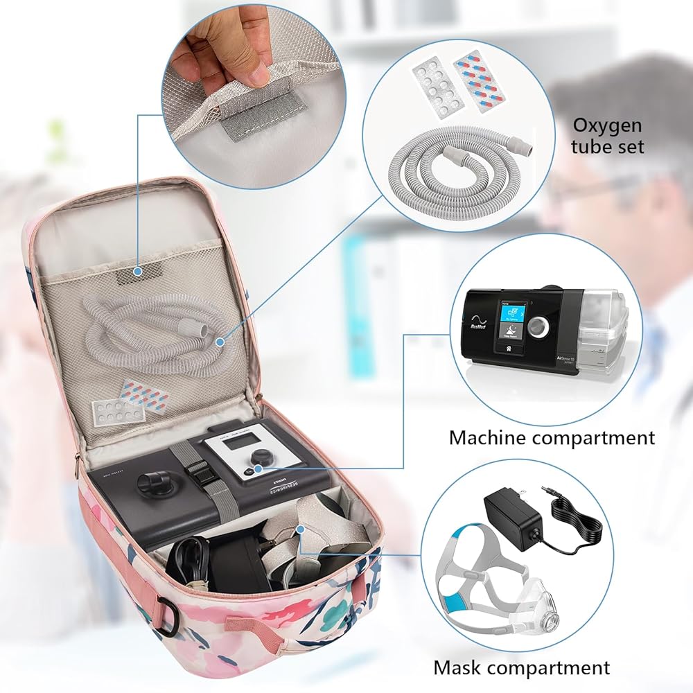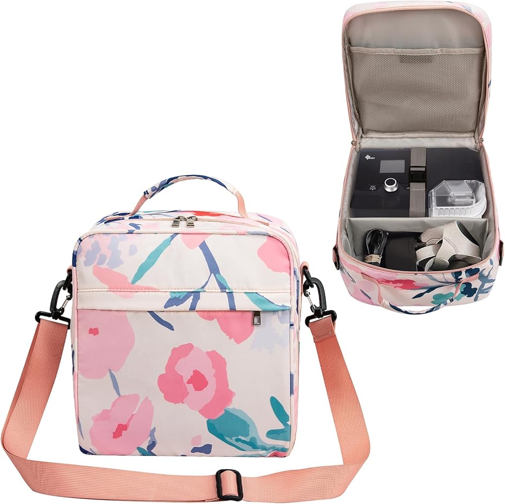 أبعاد الحقيبة: 9.8 بوصة × 6.3 بوصة × 11.4 بوصة. تتوافق حقيبة السفر هذه مع Airsense 10/ 11، وResMed Air Mini، وTranscend Micro، وDreamstation Go XT Fit، وZ2 Auto. يمكن أن تناسب هذه الحقيبة معداتك وآلاتك وأغراضك الشخصية. (الحقيبة فقط، الماكينة والملحقات غير متضمنة.)