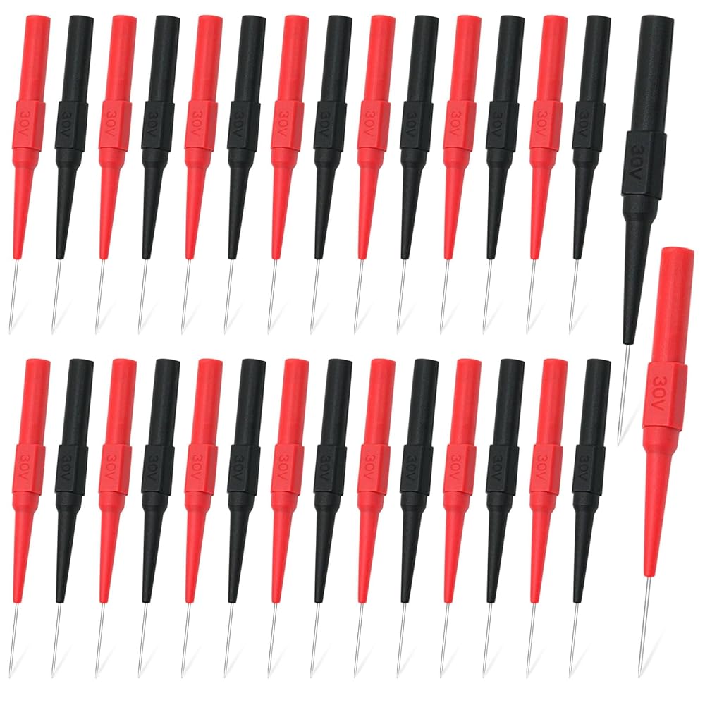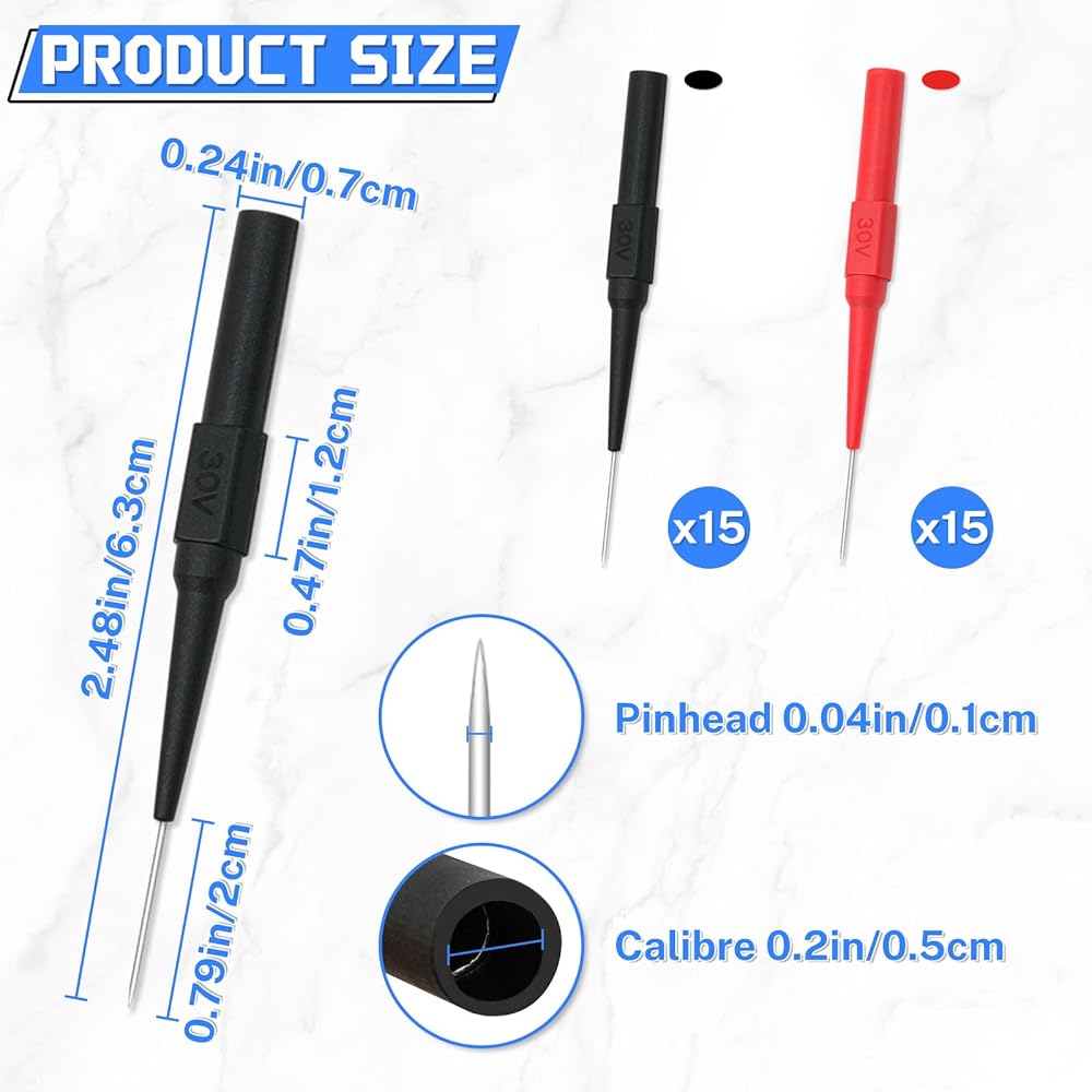 Packaging includes: You will receive 30 needle-type test probes (15 black and 15 red). Probe tip diameter: 0.1cm/0.04inches, total probe length: 6.3cm/2.48inches, needle probe length: 2cm/0.79inches.