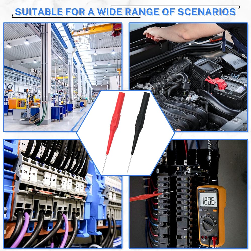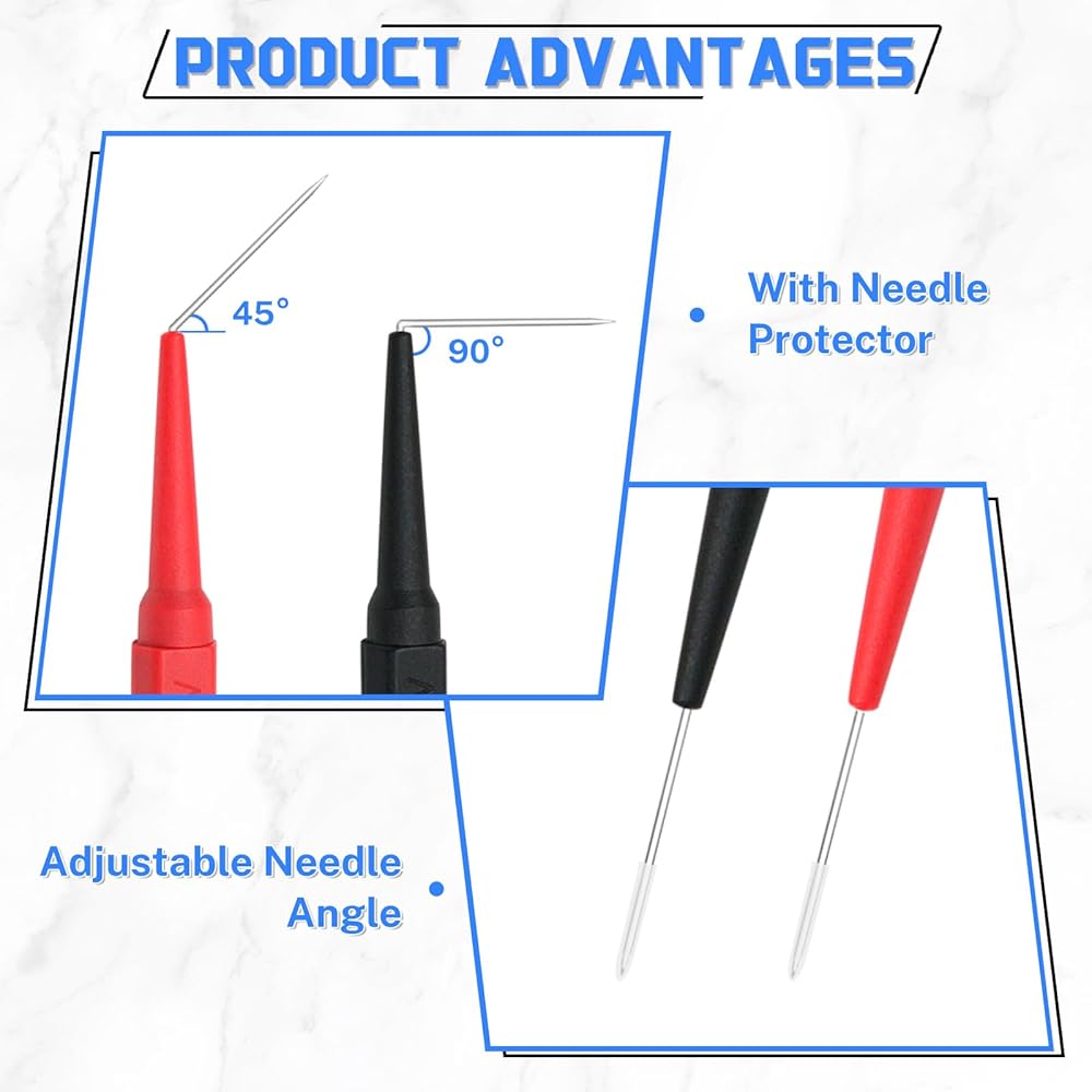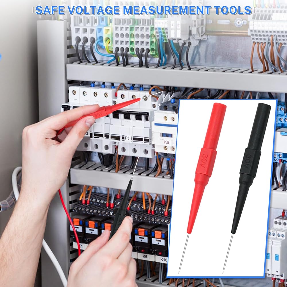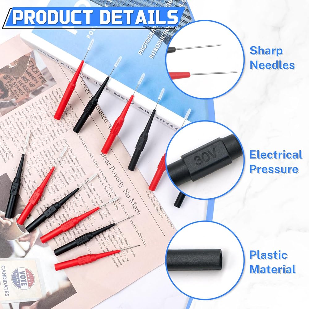 High-quality materials: The electrical test probe meter probes are made of high-quality copper and stainless steel to ensure long service life. These 0.7mm needle tips are used to gently pierce the insulation of the wires, making automotive electrical measurements easier while avoiding damage to the wires.