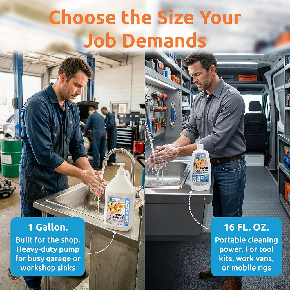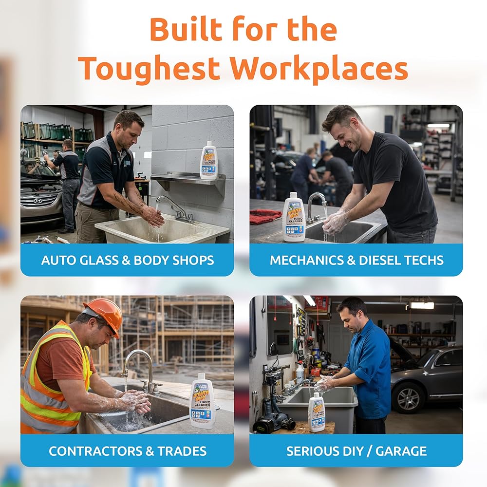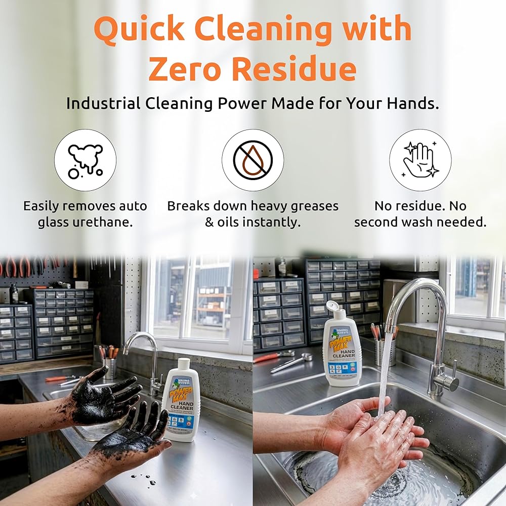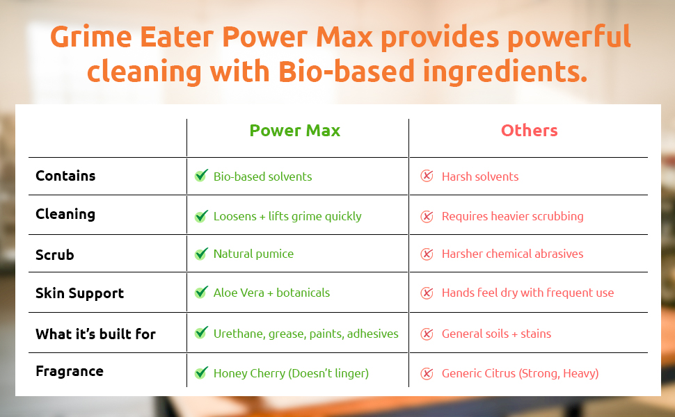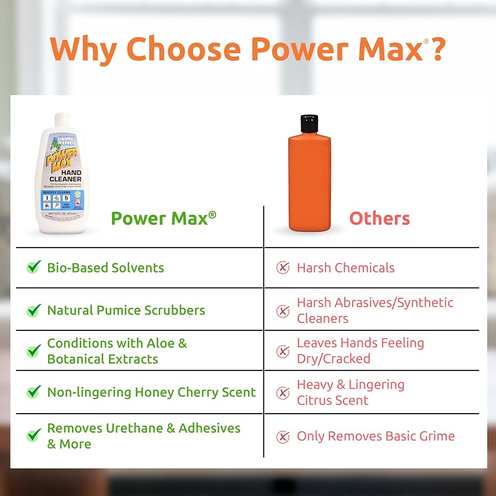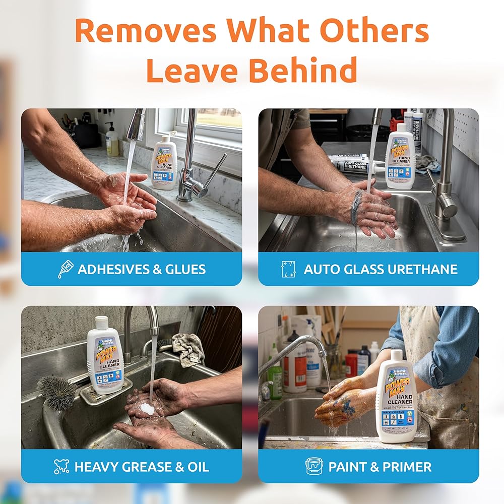 يذيب الشحوم والطلاء والمواد اللاصقة على الفور: لا تفرك حتى تصبح يديك خاملة. تستخدم تركيبة منظف الأيدي باور ماكس المذيبات الحيوية لرفع يوريثان زجاج السيارات والسيليكون وحبر الطابعة والأوساخ العنيدة بسهولة. منظف اليد المثالي للسيارات للعمال الشاقين!