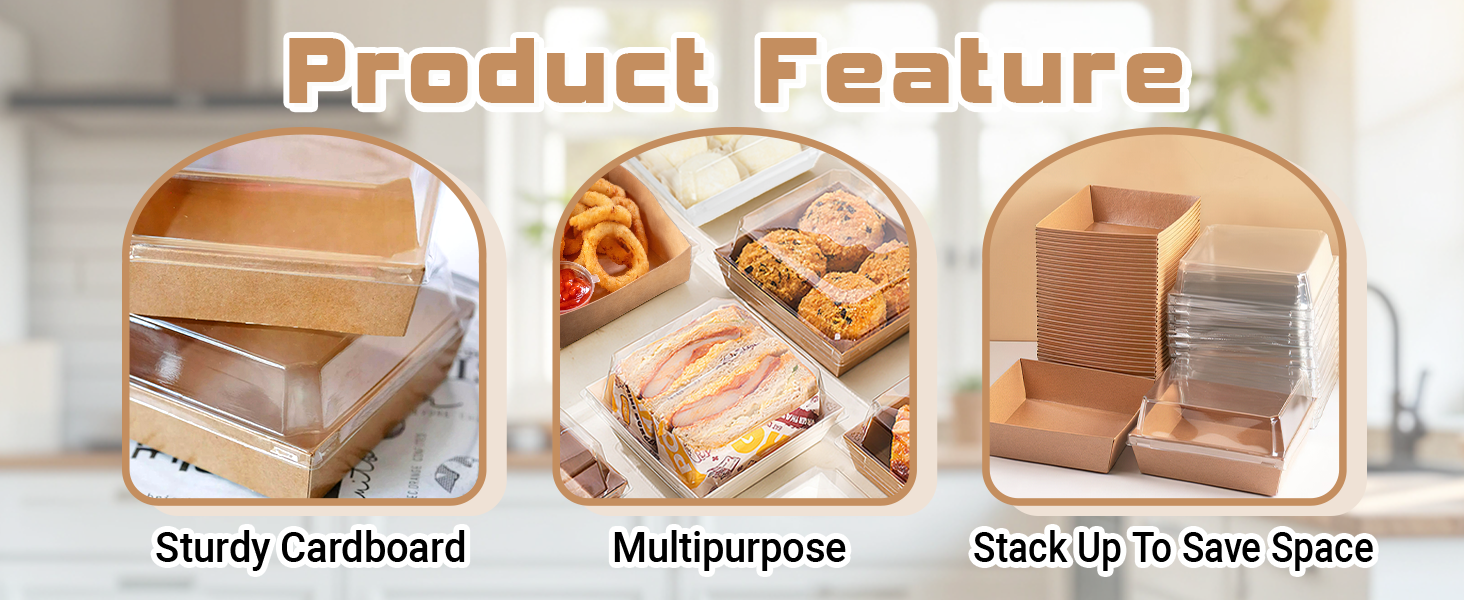استخدام واسع: يبلغ مقاس كل حاوية طعام تستخدم لمرة واحدة 4.7 × 4.7 × 2.5 بوصة وهي مناسبة لتعبئة طبق صغير من الفحم، وشريحة من الكعك، و2 ساندويتش، و4 كب كيك، و4 دونات، و4 كرات كاكاو ساخنة، و6-9 فراولة مغطاة بالشوكولاتة، والكعك، والبسكويت، والسلع المخبوزة، والبطاطس المقلية والحلويات والوجبات الخفيفة المختلفة.