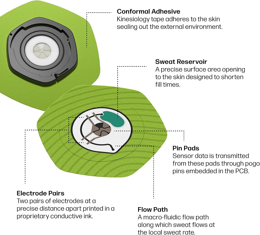 تقنية أخذ عينات العرق والرقعة الدقيقة - تتطلب رقعة العرق ذات الاستخدام الواحد، والتي يتم ارتداؤها على العضلة ذات الرأسين، ما لا يقل عن 4.5 ميكرولتر من العرق لبدء القراءة، مما يسمح للكبسولة بتقييم الأسمولية العرقية المحلية وتركيز المنحل بالكهرباء بسرعة، ثم استقراء خسائر الجسم بالكامل. تتميز الرقعة بخزان مغلق وقنوات تدفق صغيرة تبدأ في التحليل بمجرد أن تبدأ في التعرق، مما يحافظ على دقة بيانات العرق من المؤشرات الحيوية المحددة لديك.