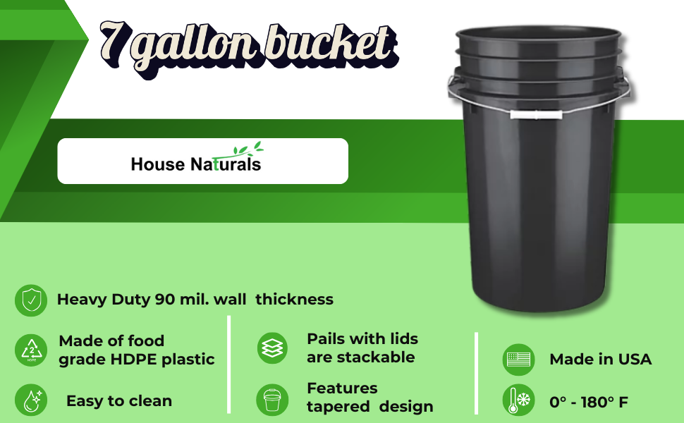 حاوية دلو من هاوس ناتشورالز سعة 7 جالون من الدرجة الغذائية الخضراء - خالية من مادة BPA - مصنوعة في الولايات المتحدة الأمريكية مع غطاء حشية برغي أسود (عبوة من قطعتين)