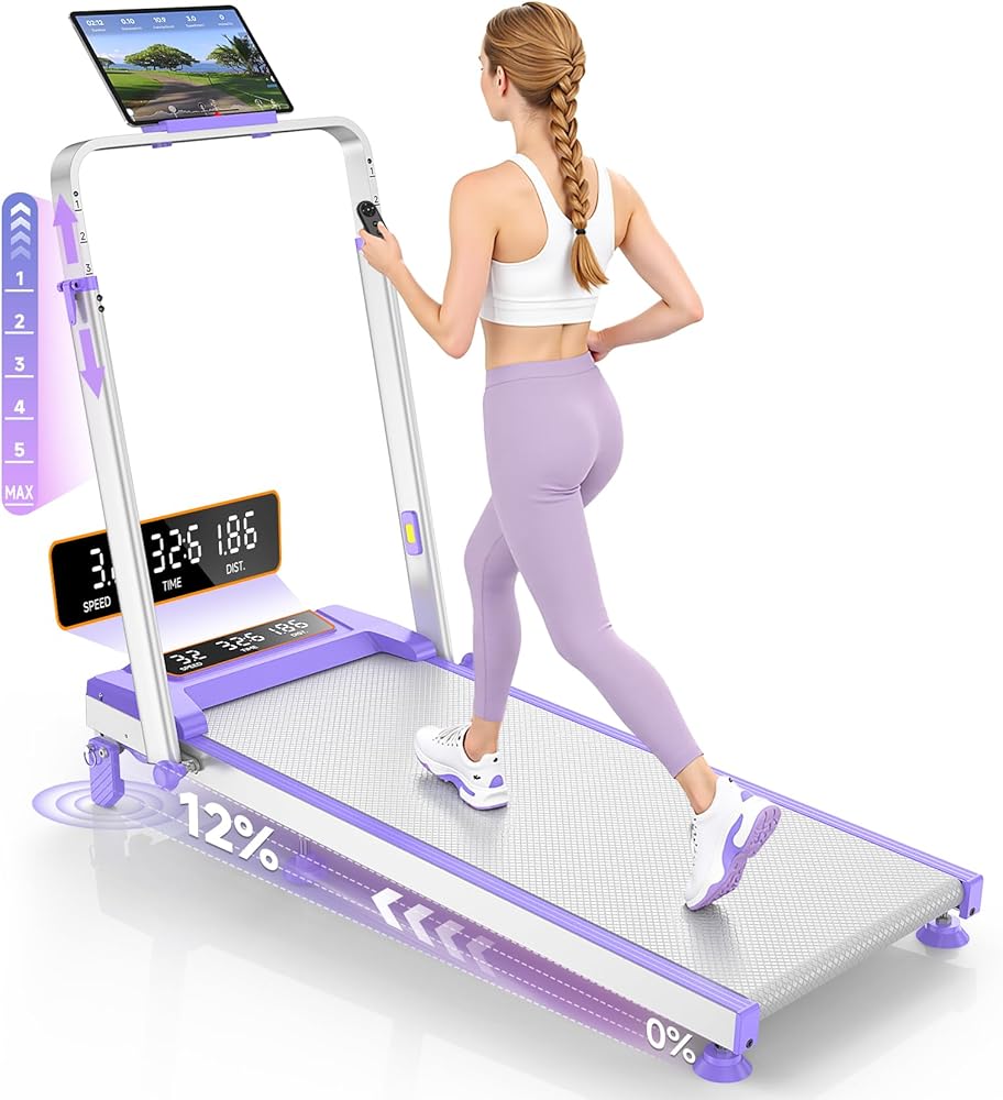جهاز سير للمشي مع ميل بنسبة 12%/ارتفاع قابل للتعديل، وسادة مشي مطورة بقدرة 3.5 حصان مع شريط مقبض، جهاز مشي 4 في 1 قابل للطي تحت المكتب، جهاز سير كهربائي محمول للمنزل 350 رطل، شاشة LED