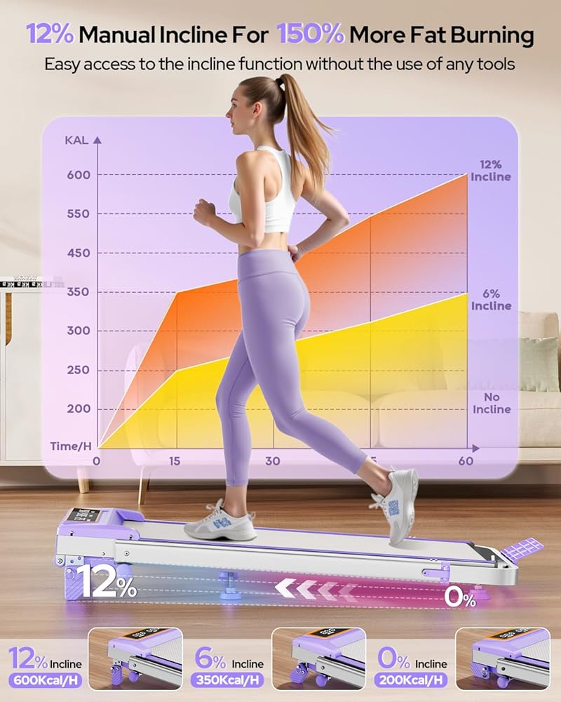 【تمرين فعال لحرق السعرات الحرارية】على عكس جهاز المشي العادي، توفر وسادة المشي ذات الميل 3 مستويات ضبط سريعة (0-6%-12%)، مما يسمح لك بالاستمتاع بتجربة المشي لمسافات طويلة وتسلق الجبال في المنزل. يساعد هذا الميل المتزايد على تنشيط المزيد من مجموعات العضلات ويمكن أن يعزز اللياقة البدنية وكفاءة حرق الدهون بنسبة تصل إلى 150%، مما يجعل كل خطوة أكثر فعالية.