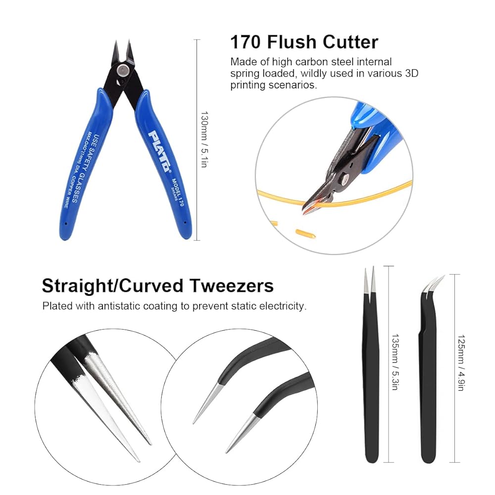 【أدوات معالجة النماذج】انتقل بمطبوعات الراتنج الخاصة بك إلى المستوى التالي من خلال مجموعة أدوات معالجة نماذج ملحقات الطابعة ثلاثية الأبعاد الخاصة بنا. صُنعت مجموعة ملحقات طباعة الراتنج بدقة، وتتضمن ملاقط بزاوية ومستقيمة، وسكين نحت مع خمس شفرات بديلة، وزوج من الكماشات. ليس فقط في إزالة الدعامات الزائدة ولكن أيضًا في تحسين التفاصيل المعقدة.
