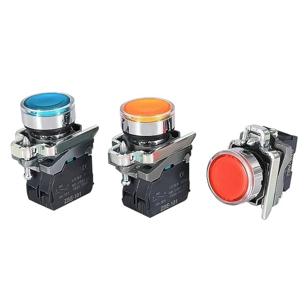 1pc Push button switch, XB4 round flat head button with light start stop normally open normally closed self-reset switch