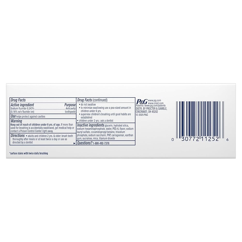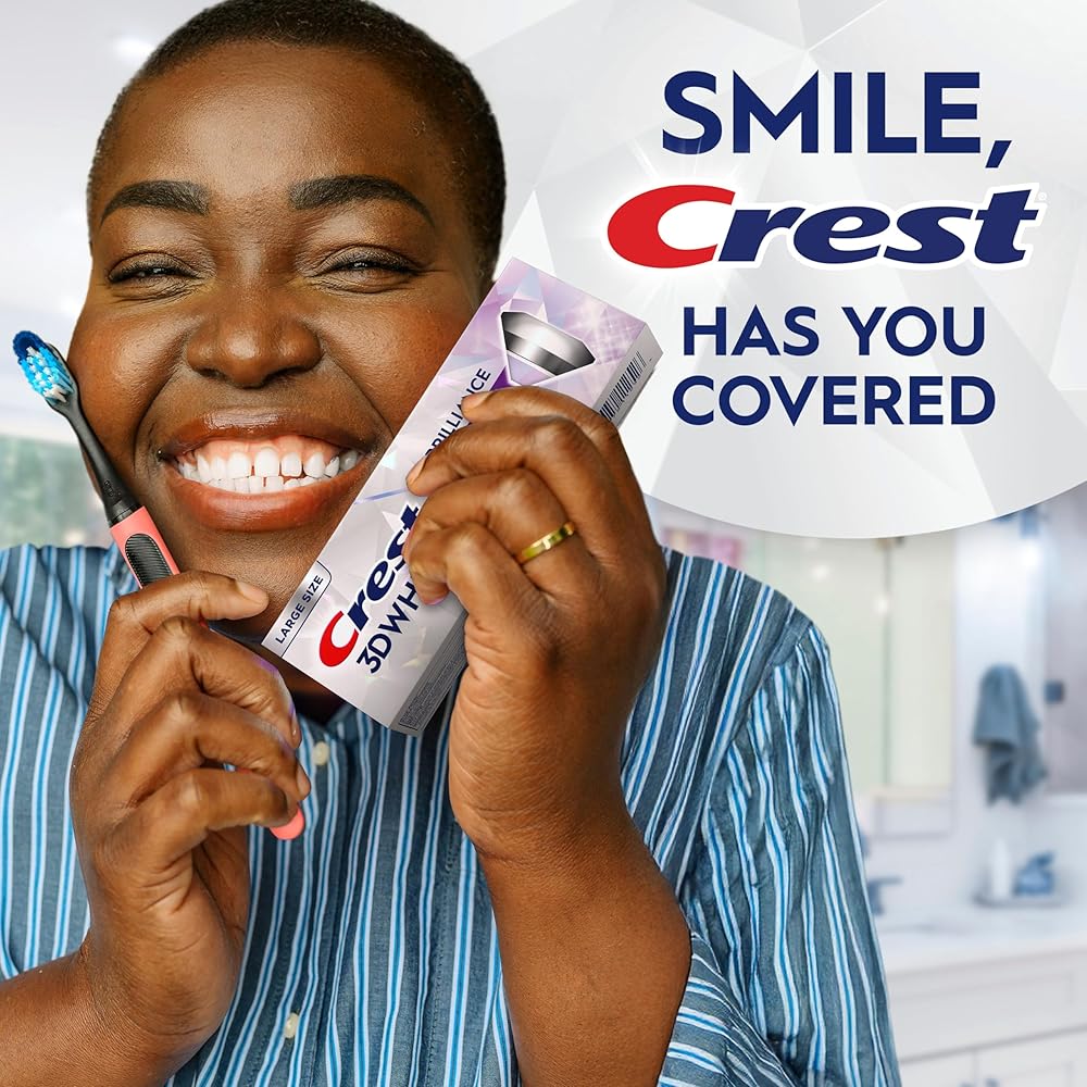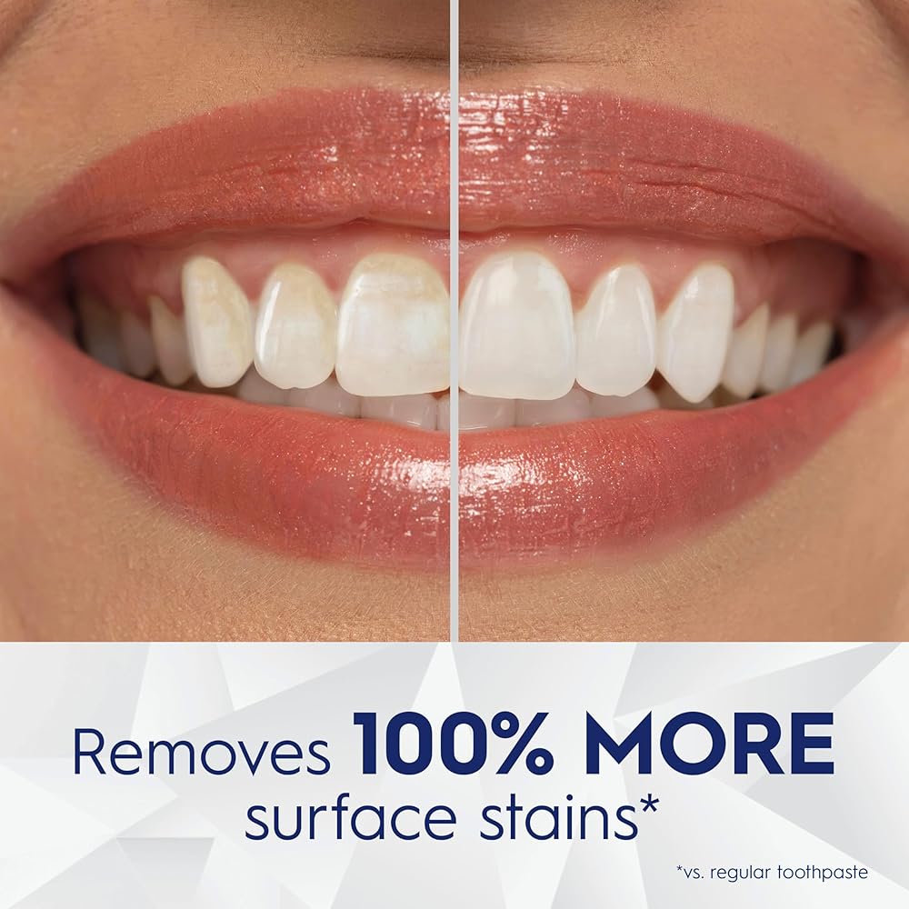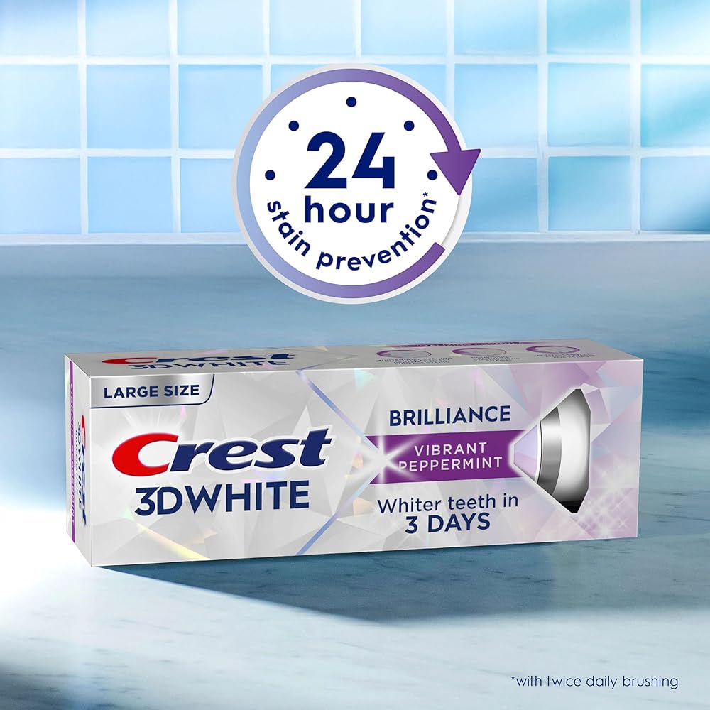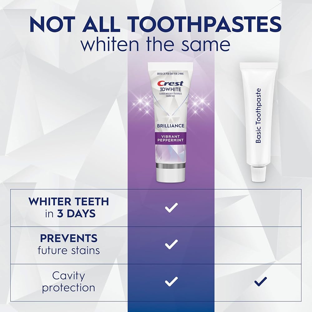 Crest 3D White Brilliance Toothpaste gives you Whiter Teeth in 3 days by removing 100% more surface stains†. This Crest 3D White Brilliance Toothpaste comes with 24-hour stain protection when paired with twice-daily brushing. The Crest 3D White Brilliance toothpaste formula contains fluoride, which helps fight cavities while whitening teeth by micro-cleansing each tooth and removing surface stains. From America's #1 Whitening Brand*. *P&G calculation based on U.S. reported sales data for year ending w/o 1/05/25 †vs. regular toothpaste.