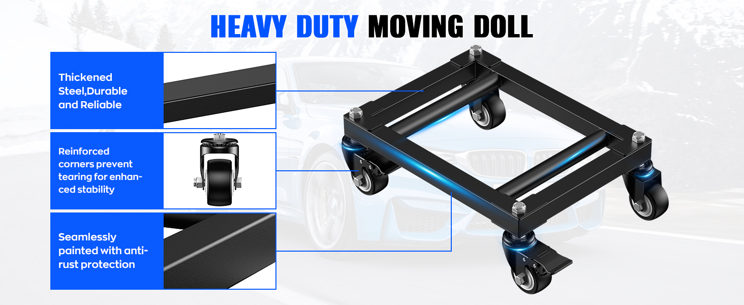 عملية سهلة الاستخدام: بعد رفع السيارة برافعة، ضع الدمية تحت العجلات الأربع. حتى في الأماكن الضيقة، يمكنك تحريك السيارة دون عناء، مما يجعلها مثالية لإعادة وضع السيارات المتوقفة أو تعديل موضعها. تعمل الفرامل التي يتم تنشيطها بالقدم على قفل العجلات على الفور، مما يوفر الراحة والأمان أثناء مهام الصيانة.
