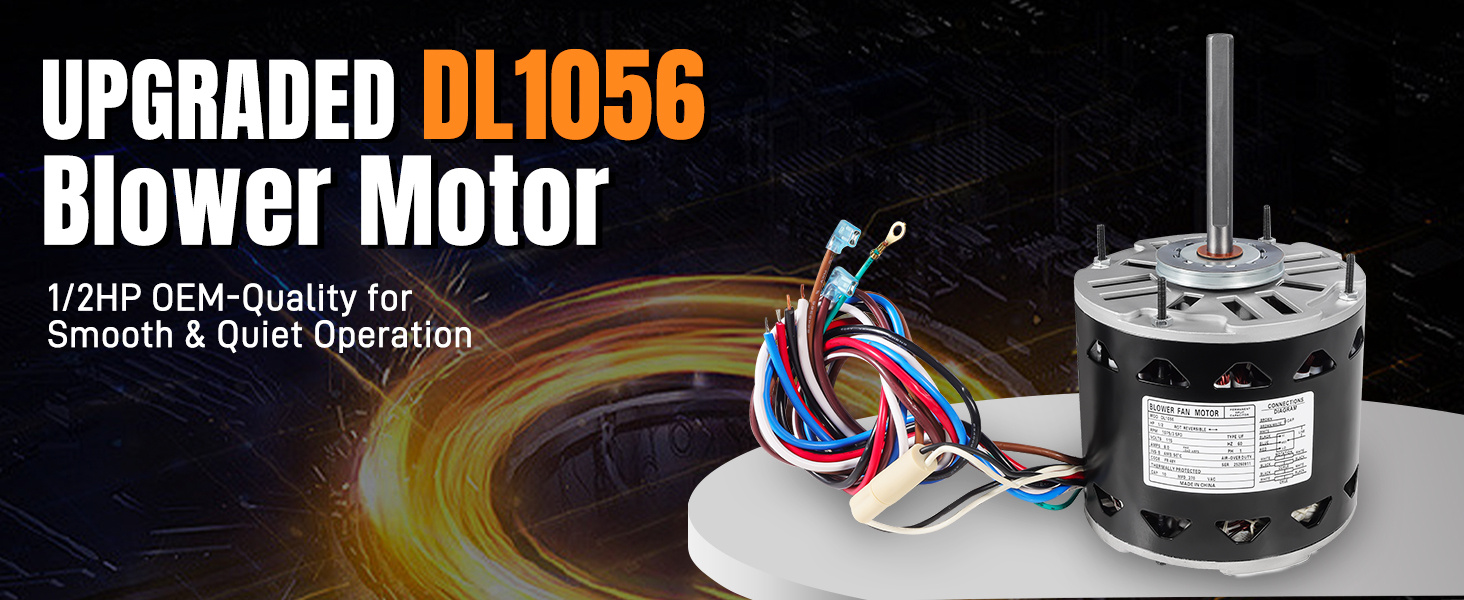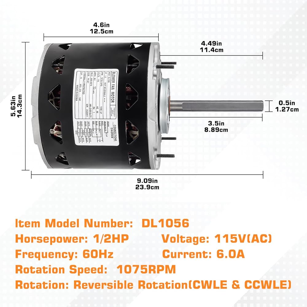 المواصفات الكهربائية: DL1056 محرك المنفاخ: 1/2 حصان، 1075 دورة في الدقيقة، 3 سرعات 115 فولت 8 أمبير 48 محمل إطار، يتضمن مكثف 10 ميكروفاراد 370 فولت