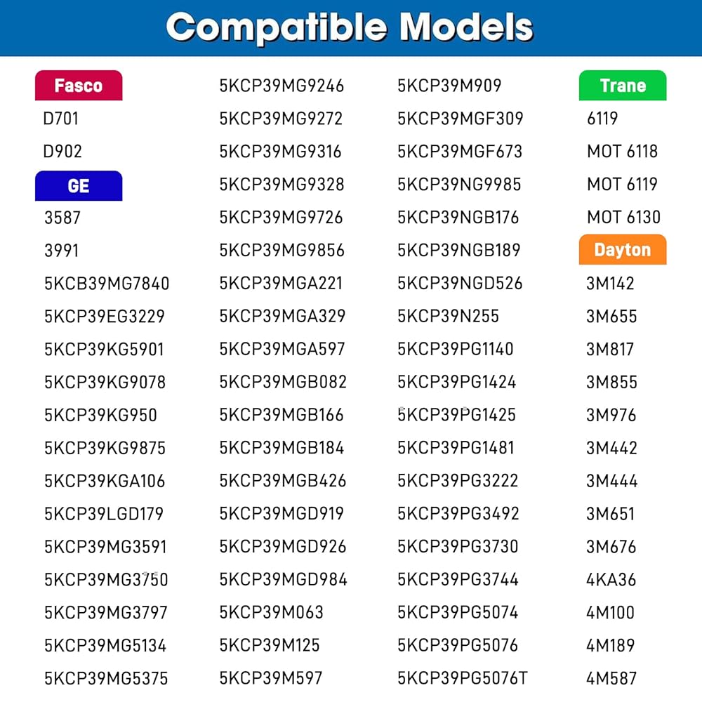 الموديلات المتوافقة: متوافقة مع A.O. سميث/سنشري DL1056、1056、321P468、323P120、323P206؛ متوافق مع فاسكو: D701؛ متوافق مع GE/Genteq: 3587؛ متوافق مع إيمرسون: 1865、K1865、3235؛ متوافق مع الناقل/BDP:5KCP39MG9272、5KCP39MG9316、5KCP39MG9328