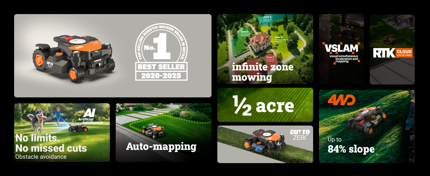 Engineered for every terrain, Worx Landroid Vision Cloud 4WD WR342 is built to master complex lawns up to ½ acre—from steep slopes and uneven ground to intricate layouts.
