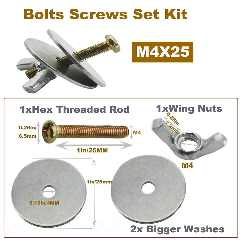 تتضمن العبوة: 10 مجموعات من مجموعة متنوعة من البراغي والصواميل، صواميل وغسالات متطابقة. 5 × M4*1 بوصة مسمار رأس مقلاة فيليبس + 10 × M4*1 غسالات (أكبر)+5 × M4 Wing Muts