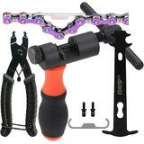 Upgrade your bike maintenance arsenal with this versatile chain tool designed for 1-13 speed bicycle chains. The heavy-duty alloy steel construction ensures durability and reliable performance, while the ergonomic comfort grip handle provides excellent control during use. This professional-grade chain breaker comes equipped with spare pins and features a built-in chain wear gauge to help you monitor your chain's condition. The tool includes measurement indicators at 0.75mm and 1.0mm (per 11 links) to assess chain stretch accurately. Its thoughtfully designed components include a main head and handle, thimble, screw rod and crossbar, and a convenient storage handle that's both rotatable and removable. The precision-engineered delivery ejector pins ensure smooth operation whether you're breaking, removing, or rejoining chains. Perfect for both road bikes and mountain bikes, this comprehensive tool helps extend the life of your bicycle's drivetrain through proper maintenance and timely chain replacement.