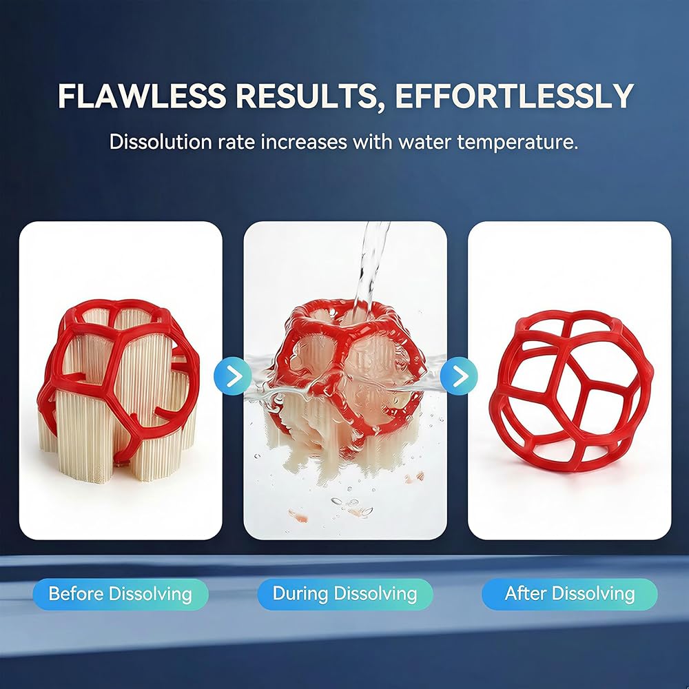 دعم قابل للذوبان في الماء خالٍ من البقايا: يذوب تمامًا في ماء دافئ بدرجة حرارة 25-40 درجة مئوية في غضون 10-30 دقيقة، لا حاجة إلى كشط يدوي - مثالي للهياكل المعقدة، والتجاويف المغلقة، والأجزاء المتدلية الدقيقة، مع الحفاظ على الأسطح الملساء للمطبوعات عالية الدقة