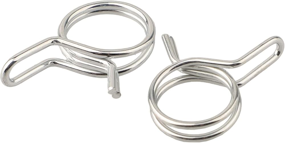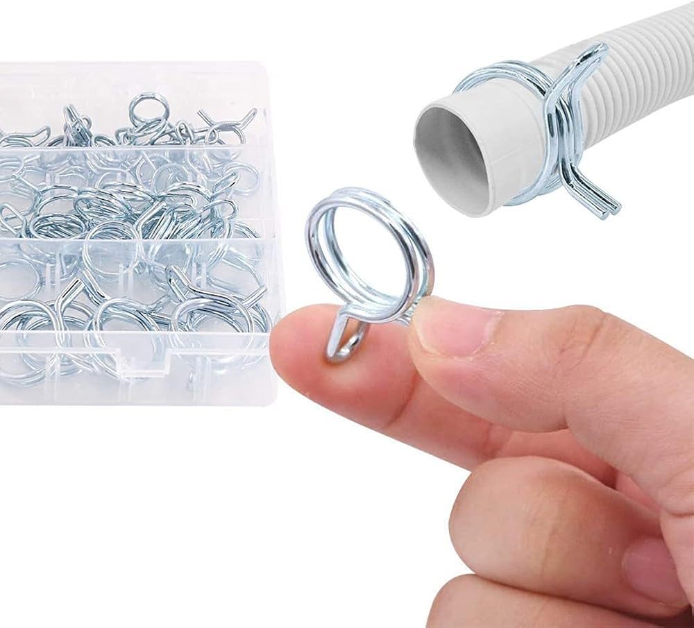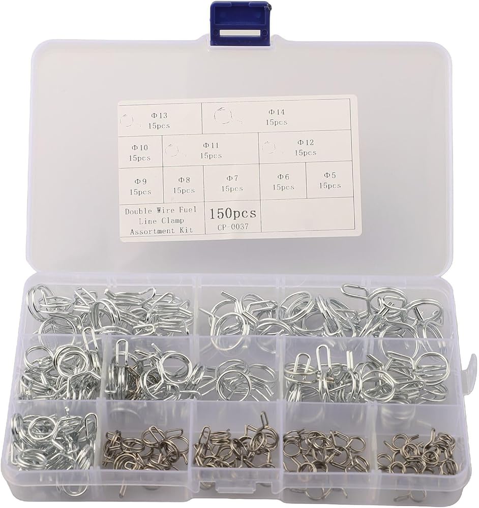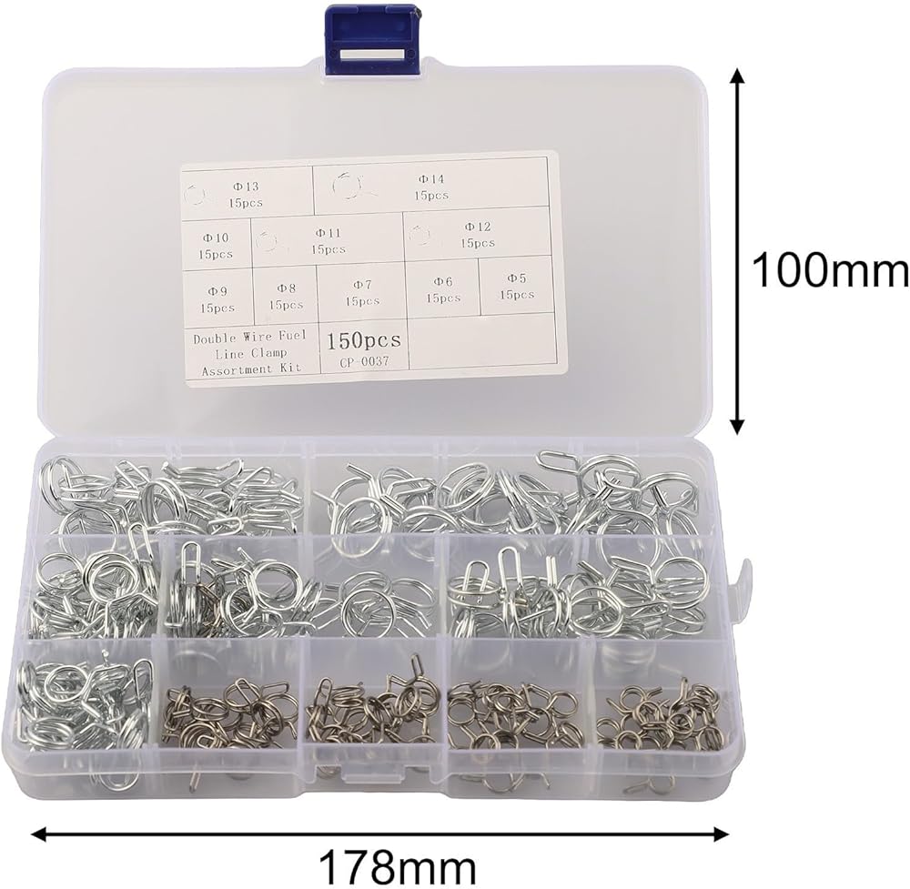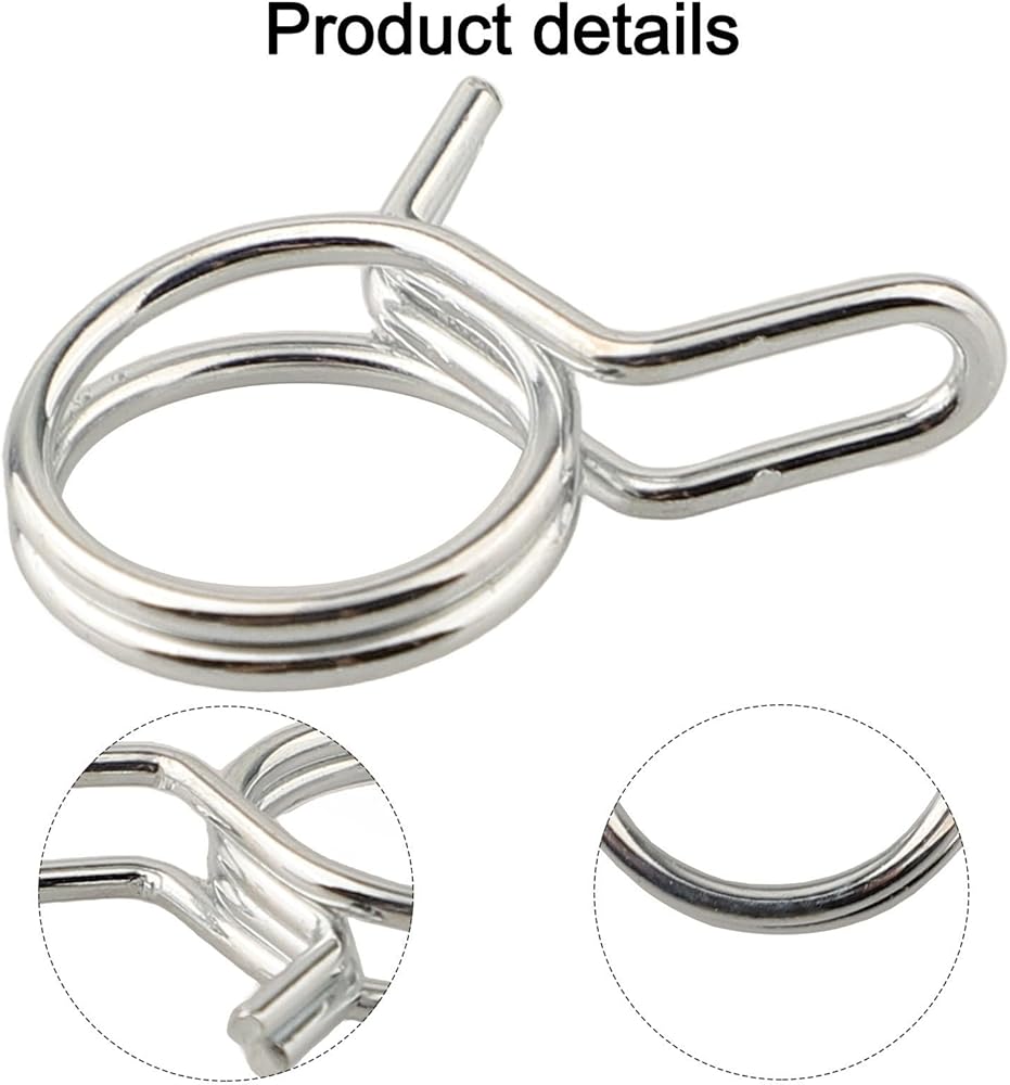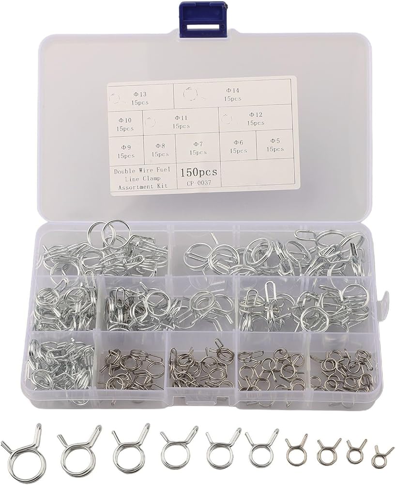 *10 values sizes hose clamp kits: 5mm, 6mm, 7mm, 8mm, 9mm, 10mm, 11mm, 12mm, 13mm, 14mm; Different sizes to meet your multi needs*Made of stainless steel and carbon steel, strong, not easy to break, for long time service*Double wire spring hose clips, spring loaded clamps for hose applications; Widely used in machinery, hardware, cars, motorcycles, yachts, trailers, toys, gifts, furniture, appliances, and so on*These double wire spring clips are polished smooth to avoid damage to the hose, suitable for sealing hoses.