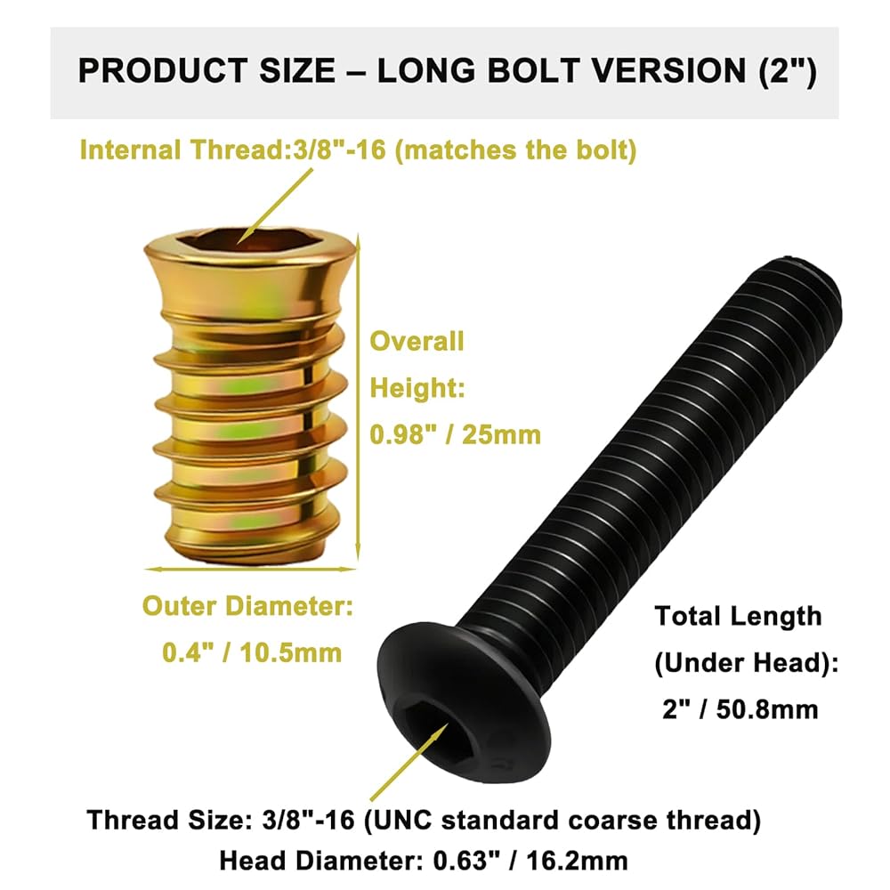 This Furniture Fastener Kit is designed for assembling and repairing wood furniture with strong, reliable joints. Each bolt uses a 3/8"-16 standard thread, approximately equal to a diameter of 9.53mm and a pitch of 1.59mm, ensuring a precise and stable fit.