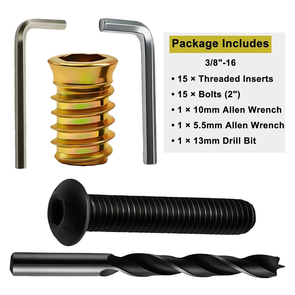 The set includes 15 zinc-plated threaded inserts (3/8"-16 x 25mm), 15 black oxide carbon steel bolts (2 inch, thread length only; measured without head), two wrenches (10mm and 5.5mm), and one 13mm drill bit. Zinc-plated inserts provide corrosion resistance, while black oxide bolts offer wear protection and consistent performance.
