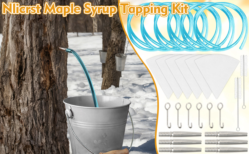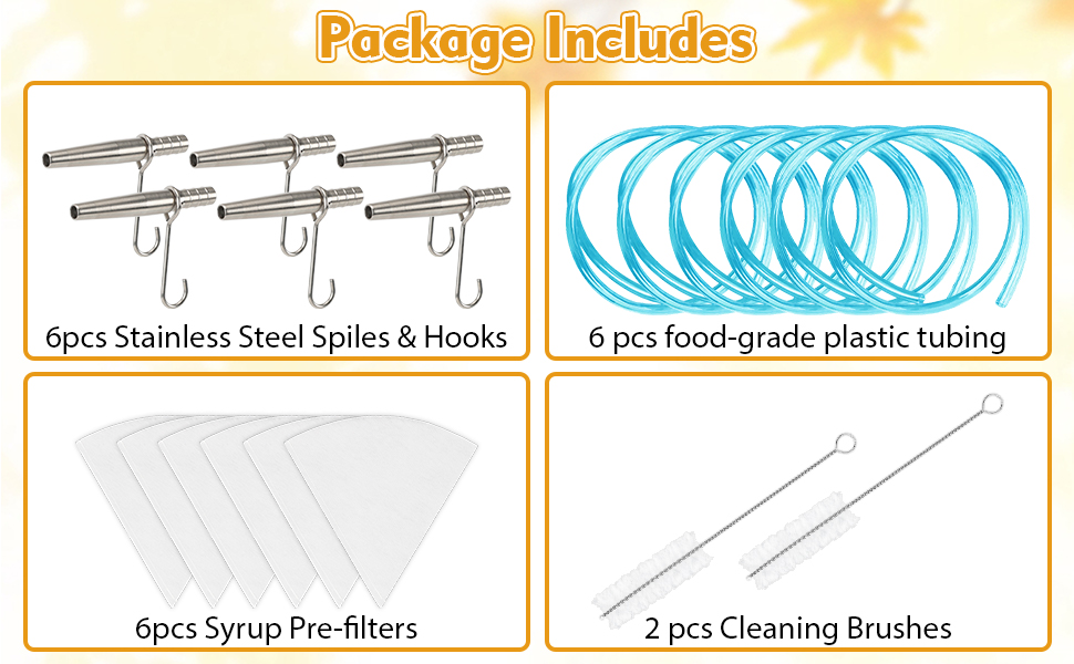 【مجموعة شراب القيقب الكاملة】: تشتمل مجموعة شراب القيقب هذه على كل ما تحتاجه لبدء مغامرة شراب القيقب: 6 صنابير وخطافات متينة من الفولاذ المقاوم للصدأ، و6 أنابيب صالحة للطعام (لسهولة مراقبة تدفق النسغ)، وفرشتي تنظيف فعالتين، و6 مرشحات مسبقة الجودة. إنها مجموعة البداية المثالية للهواة ومنتجي المنازل