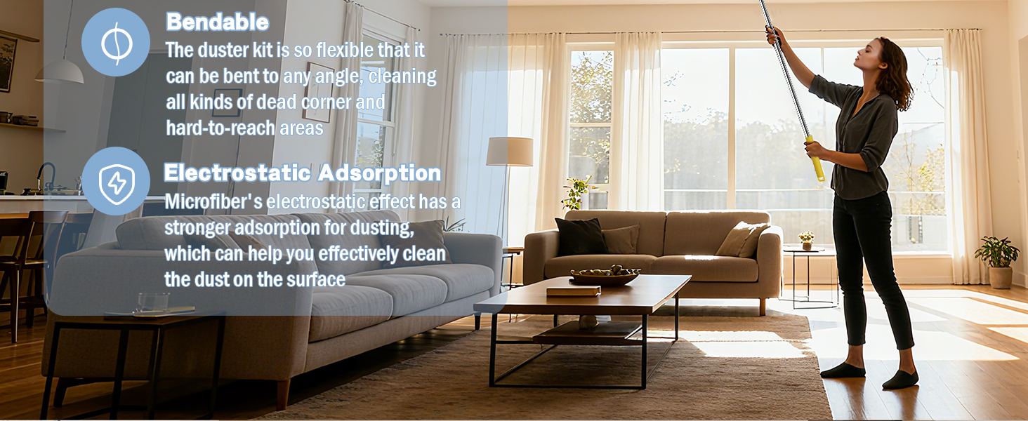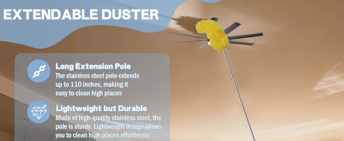 استخدامات متنوعة: يمكن أن تصل غبار الريش المصنوع من الألياف الدقيقة إلى أعلى الجدران العالية، ومراوح السقف، والخزائن العالية، وتركيبات الإضاءة، والزوايا العالية، وحتى الأماكن الصغيرة الطويلة أيضًا مثل بين الغسالات والمجففات، وبين الثلاجة والخزائن وحتى تحت الموقد.