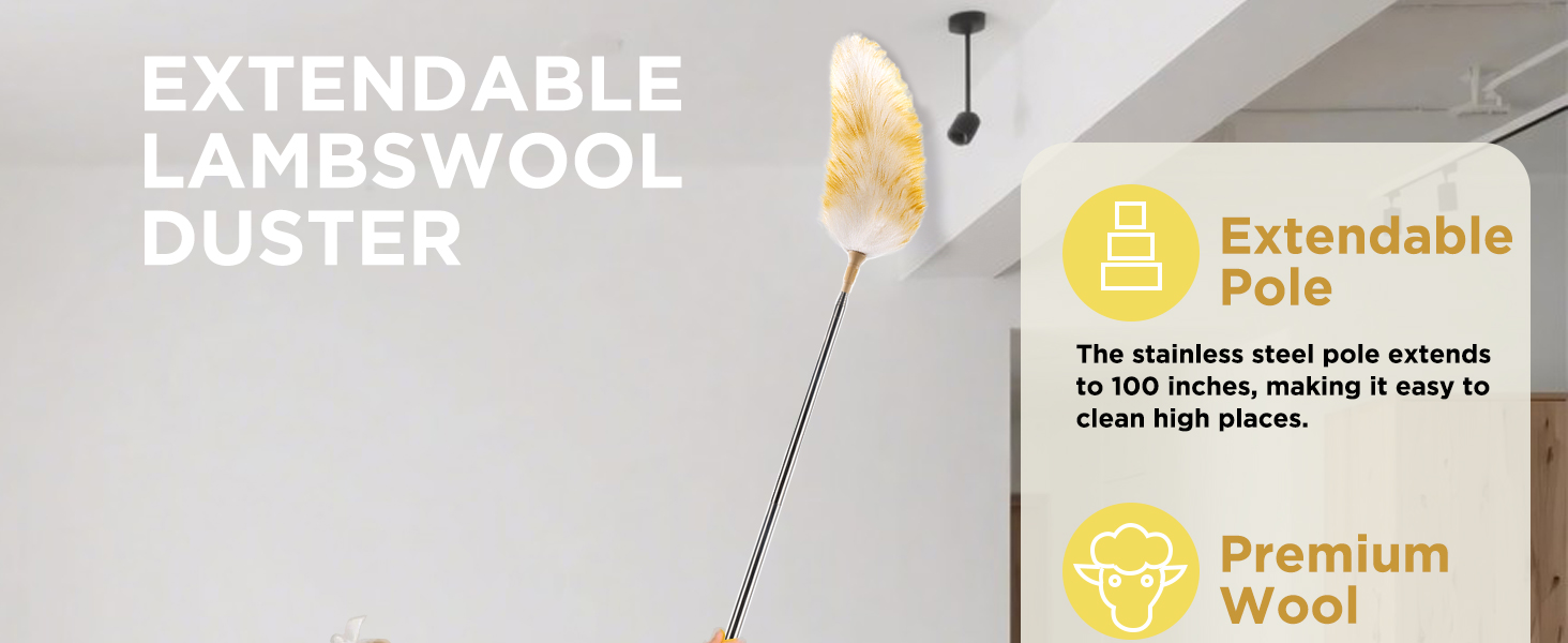 【عمود قابل للتمديد】يمتد القطب المصنوع من الفولاذ المقاوم للصدأ إلى 100 بوصة لسهولة تنظيف الأسقف والأرفف والمراوح والمساحات الضيقة.