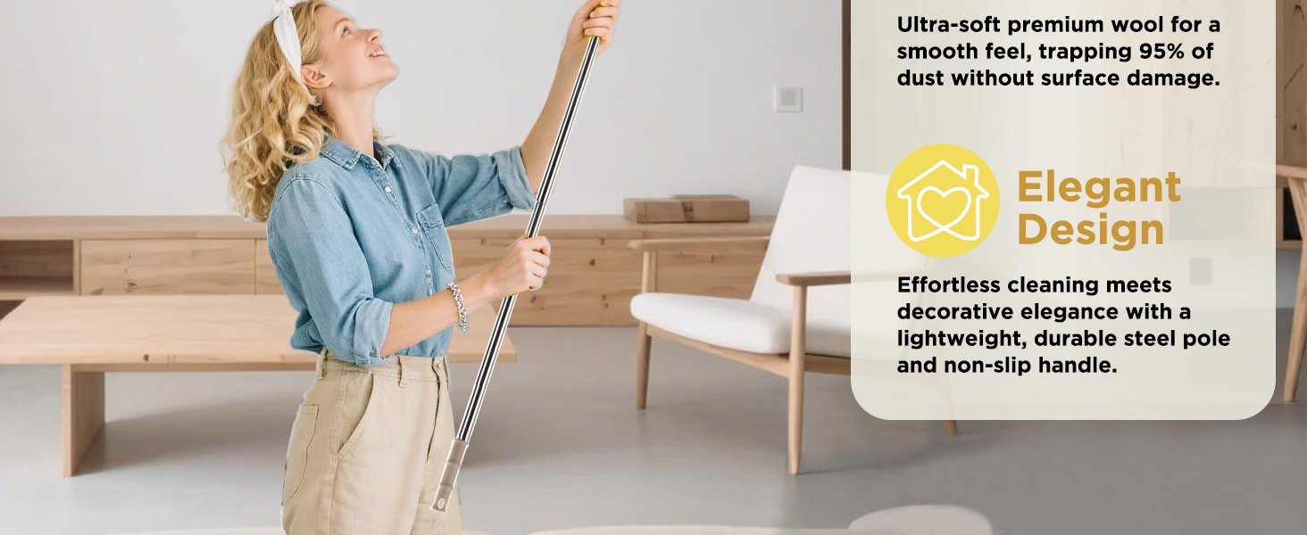 【تصميم أنيق】تجمع منفضة الغبار هذه بين التنظيف السهل والأناقة الزخرفية، وتتميز بعمود خفيف الوزن من الفولاذ المقاوم للصدأ ومقبض غير قابل للانزلاق متين ومعزز للمساحة.