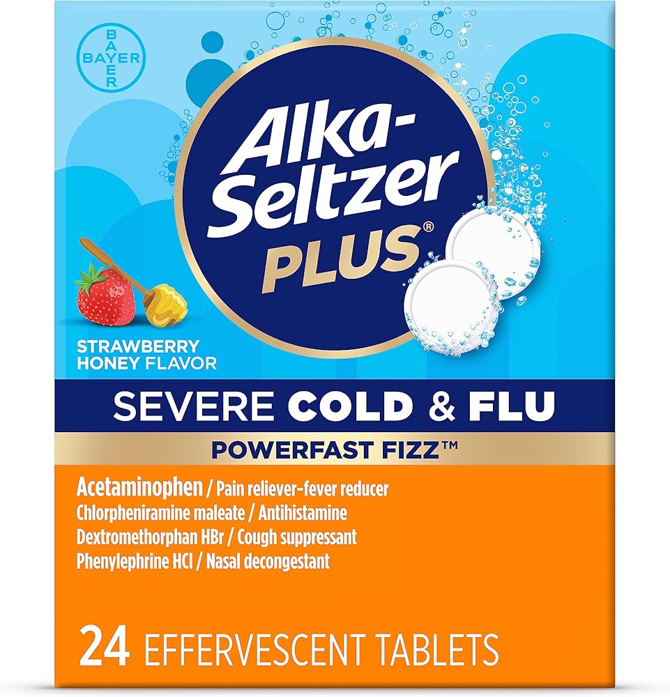 Whether you “caught a bug” from a friend, loved one, coworker or perfect stranger, it's good to know Alka-Seltzer Plus is always your ally when it comes to cold and flu symptom relief. Get fast, effective medicine for your cough and chest congestion. Alka-Seltzer Plus Maximum Strength Effervescent Tablets dissolve quickly in water before you take them. As you drink the refreshing, sparkling cool blueberry pomegranate flavored solution, Alka-Seltzer Plus works fast to relieve your worst cough symptoms: Controls Cough, Relieves Chest Congestion, Thins & Loosens Mucus,