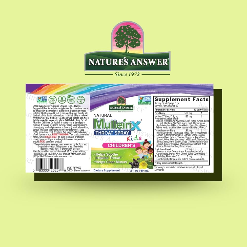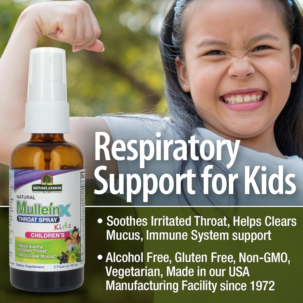 إجابة الطبيعة Mullein X Kids Throat Spray 2oz - خالي من الغلوتين، نباتي، خالي من الكحول، غير معدل وراثيا، يزيل المخاط، يهدئ الحلق المتهيج، صنع في الولايات المتحدة الأمريكية - دعم للأطفال والصغار - حجم السفر