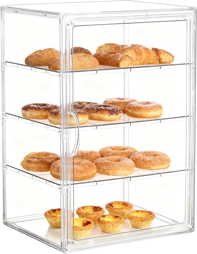 • Customizable Display: Four fully adjustable shelves let you create the perfect layout for items of any height – from muffins and bagels to layered cakes.