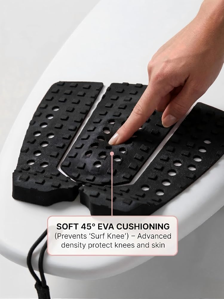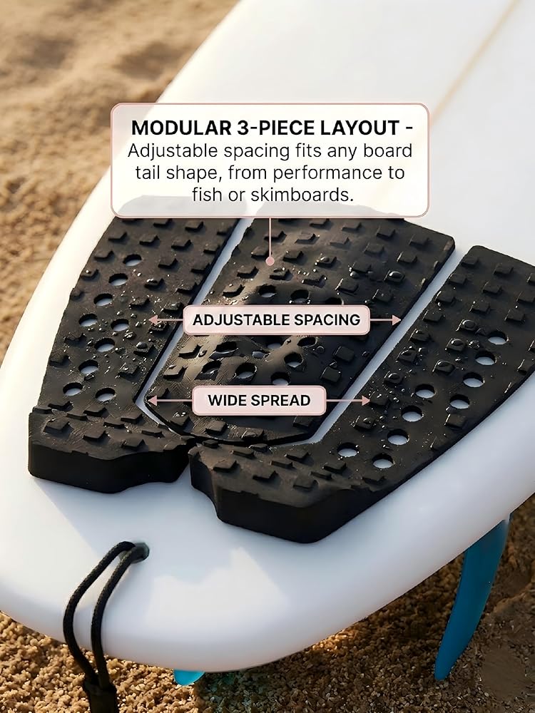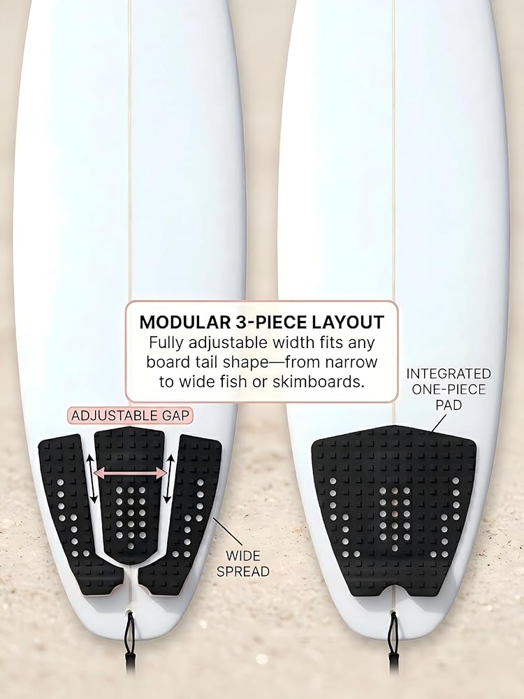 The 3-piece layout fits any board tail shape—from narrow performance boards to wide fish or skimboards. You can spread the pieces apart for extra width or push them together for a traditional feel.