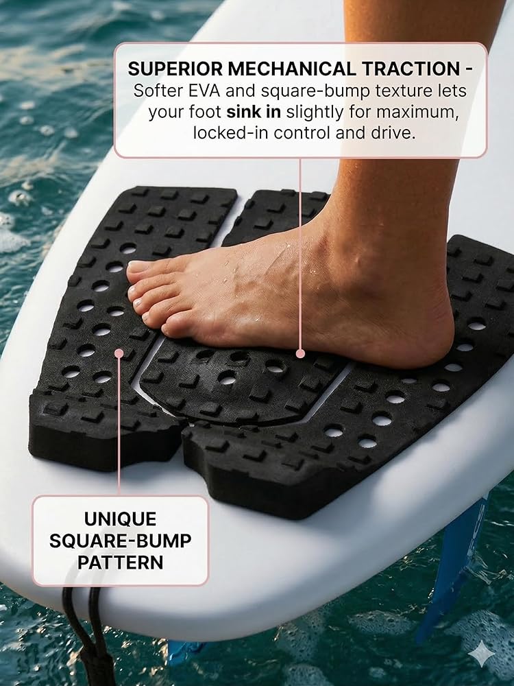 The softer material allows your foot to "sink" slightly into the pad, creating superior mechanical traction. Combined with the square-tread texture, it ensures your back foot stays locked for maximum control and drive.