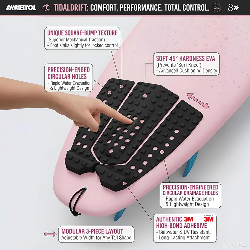 Experience the perfect balance of comfort and performance with TIDALDRIFT. Most surfers suffer from "surf knees" caused by traditional hard EVA (55-60° hardness). Our mission was to solve this. By utilizing a specialized 45° hardness EVA, we've created a traction pad that is not only the grippiest in the water but also the kindest to your skin. The unique square-bump pattern and circular drainage holes ensure you have total control over your board while keeping it lightweight. Whether you are a pro pushing through a heavy carve or a beginner practicing your pop-up, TIDALDRIFT gives you the confidence to stay on your board longer.