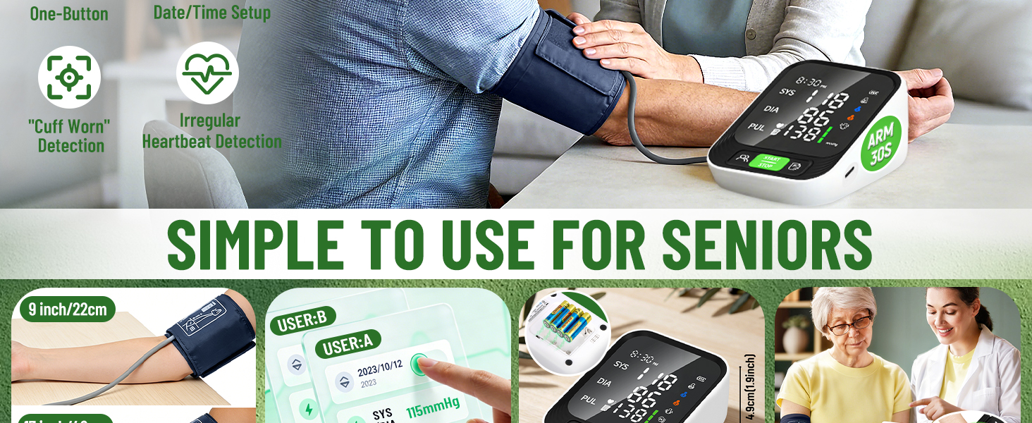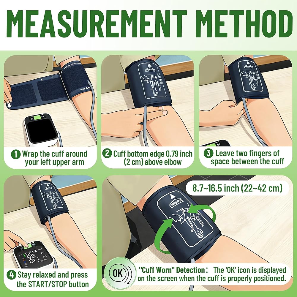 أساور كبيرة قابلة للتعديل: تأتي مع أساور عريضة قابلة للتعديل تناسب مقاسات الذراع من 8.7 إلى 16.5 بوصة. يكتشف تلقائيًا الوضع غير الصحيح أثناء القياس، ويعرض مستويات ضغط الدم باستخدام مؤشر مرمز بالألوان، ويوفر تنبيهات بشأن عدم انتظام ضربات القلب أو غيرها من التشوهات